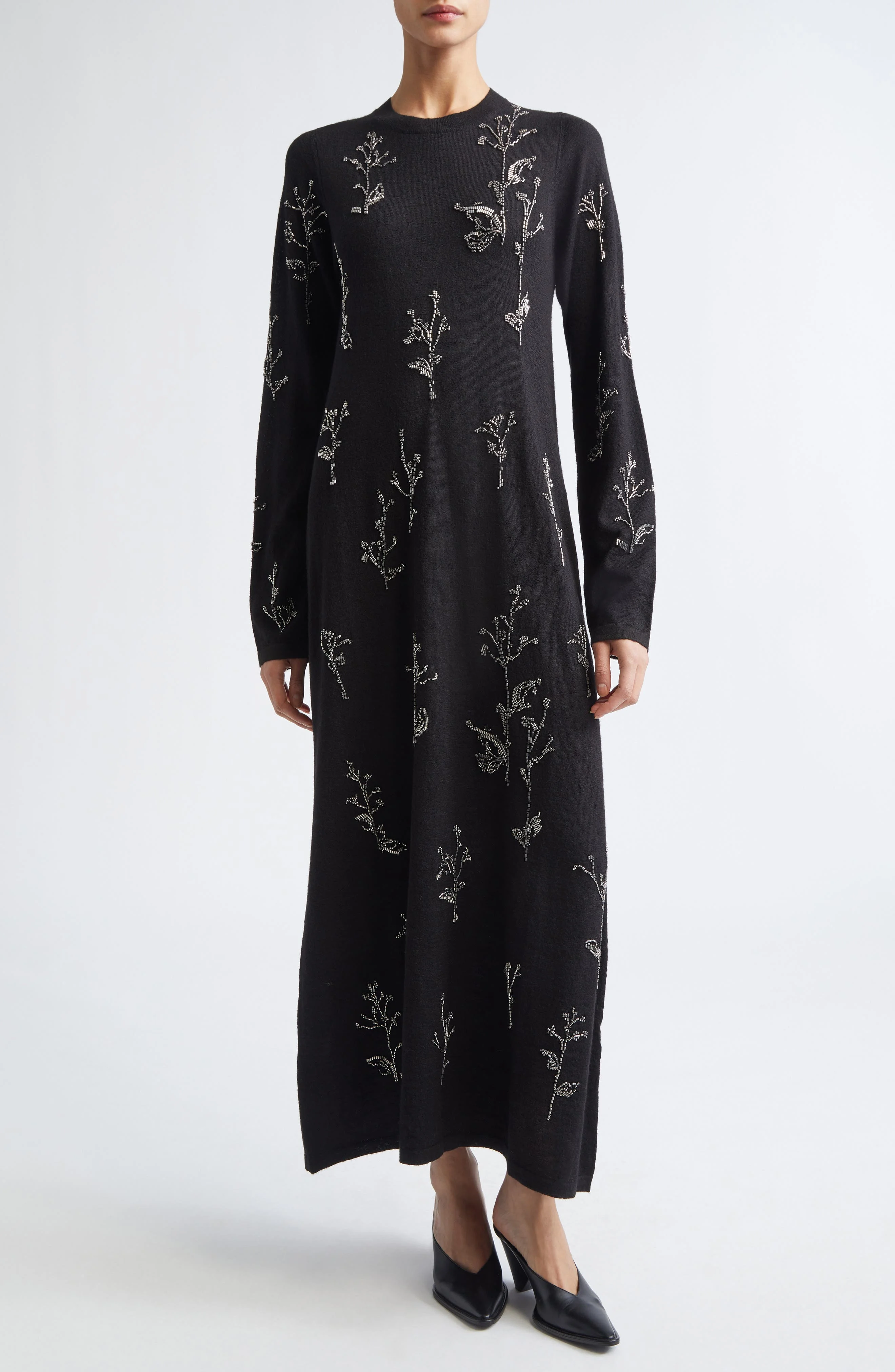 From the holiday '25 capsule collection, this elegant floor-grazing dress is made from silk-softened llama, then lit with scores of silvery beads arranged in an exquisite garden of sparkling branches and leaves. Jewel neck Long sleeves 70% llama, 30% silk Dry clean Imported Designer Clothing