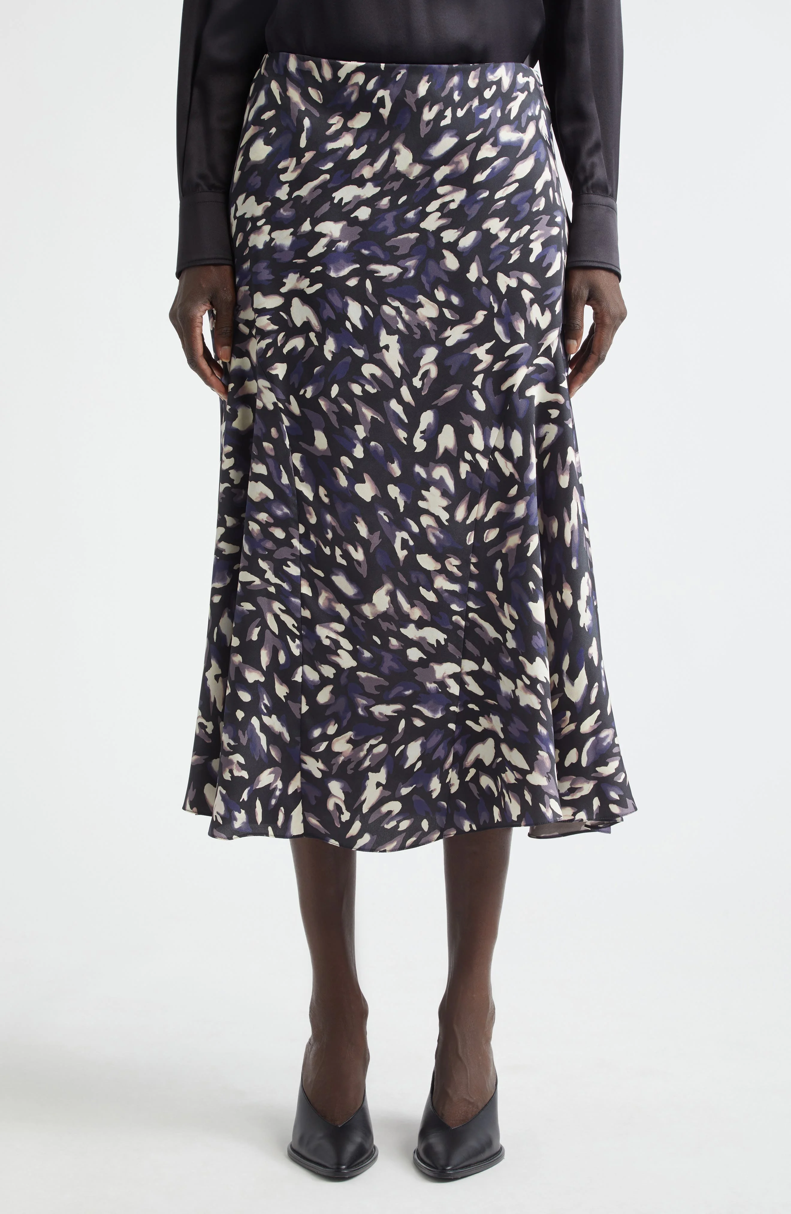 Elegance and ease coalesce in this free-flowing A-line midi skirt dappled in a dreamy abstract print that blurs the lines between animal spots and painterly brushstrokes—echoing the surrealist spirit of the spring '26 collection. Hidden side-zip closure 100% polyester Dry clean Made in Italy Designer Clothing