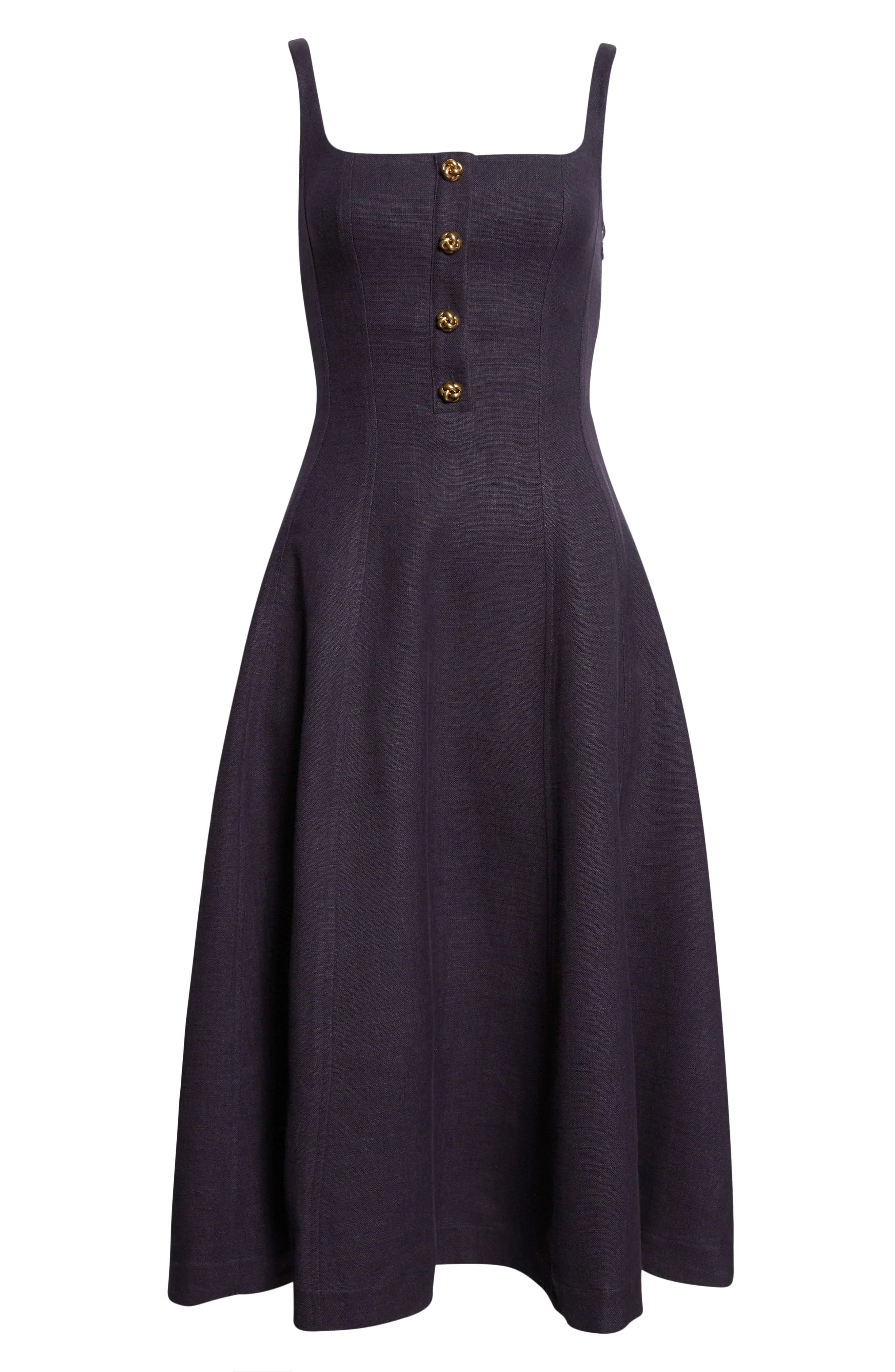The label's sophisticated French-American fusion that blends Parisian refinement with American practicality and ease informs the impeccable tailoring of this midi dress that's fitted through the bodice then flares out to a voluminous skirt. It's structured from a textural linen blend, with shapely seams at the waist and signature knotted buttons that amplify the vintage inspiration with a golden gleam. Front button closure Square neck Sleeveless 67% linen, 33% viscose Dry clean Made in Italy Designer Clothing