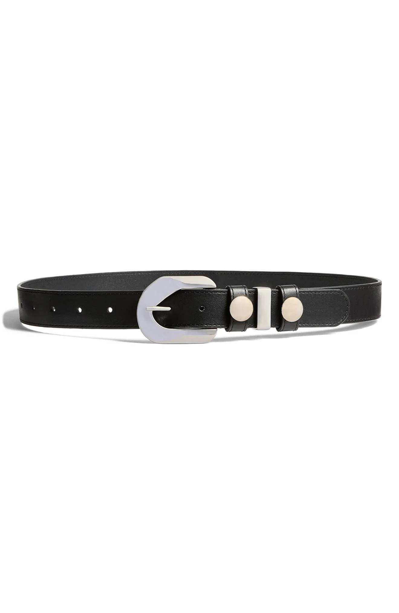 A sculptural buckle and studded keepers add a Western statement to this calfskin belt that offers a modern, streamlined riff on vintage styles. Leather Made in Spain