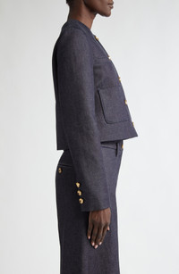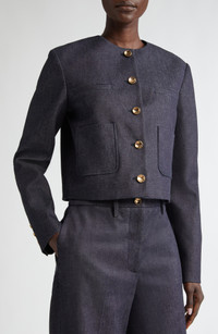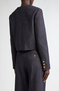 A neat, slim-fitting cut defines this cropped jacket set agleam with golden buttons and cut from richly textured woven cotton dyed a denim-like indigo hue. Front button closure Nonfunctional four-button cuffs Chest welt pocket; front patch pockets 98% cotton, 2% polyurethane Dry clean Made in Italy Designer Clothing