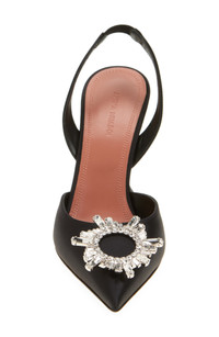 This silk-satin version of the designer's cult-status pointy-toe pump is glammed up with a sparkly crystal brooch inspired by an art deco sunburst mirror. The signature pedestal-like flared heel has the sophisticated look of a stiletto but is more comfortable and provides added stability on city streets. 3 3/4" (95mm) heel (size 37) Elasticized slingback strap Silk upper/leather lining and sole Made in Italy Designer Shoes