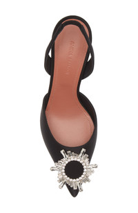 This silky satin version of the designer's cult-status pointy-toe pump is glammed up with a sparkly crystal brooch inspired by an art deco sunburst mirror. The signature pedestal-like flared heel has the sophisticated look of a stiletto but is more comfortable and provides added stability on city streets. 2 3/4" heel, 69mm (size 8.5) Elasticized slingback strap Textile upper/leather lining/leather and synthetic sole Made in Italy Designer Shoes