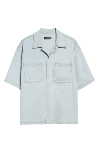 AMIRI 3D Logo Short Sleeve Snap-Up Denim Shirt in Light Indigo at Nordstrom