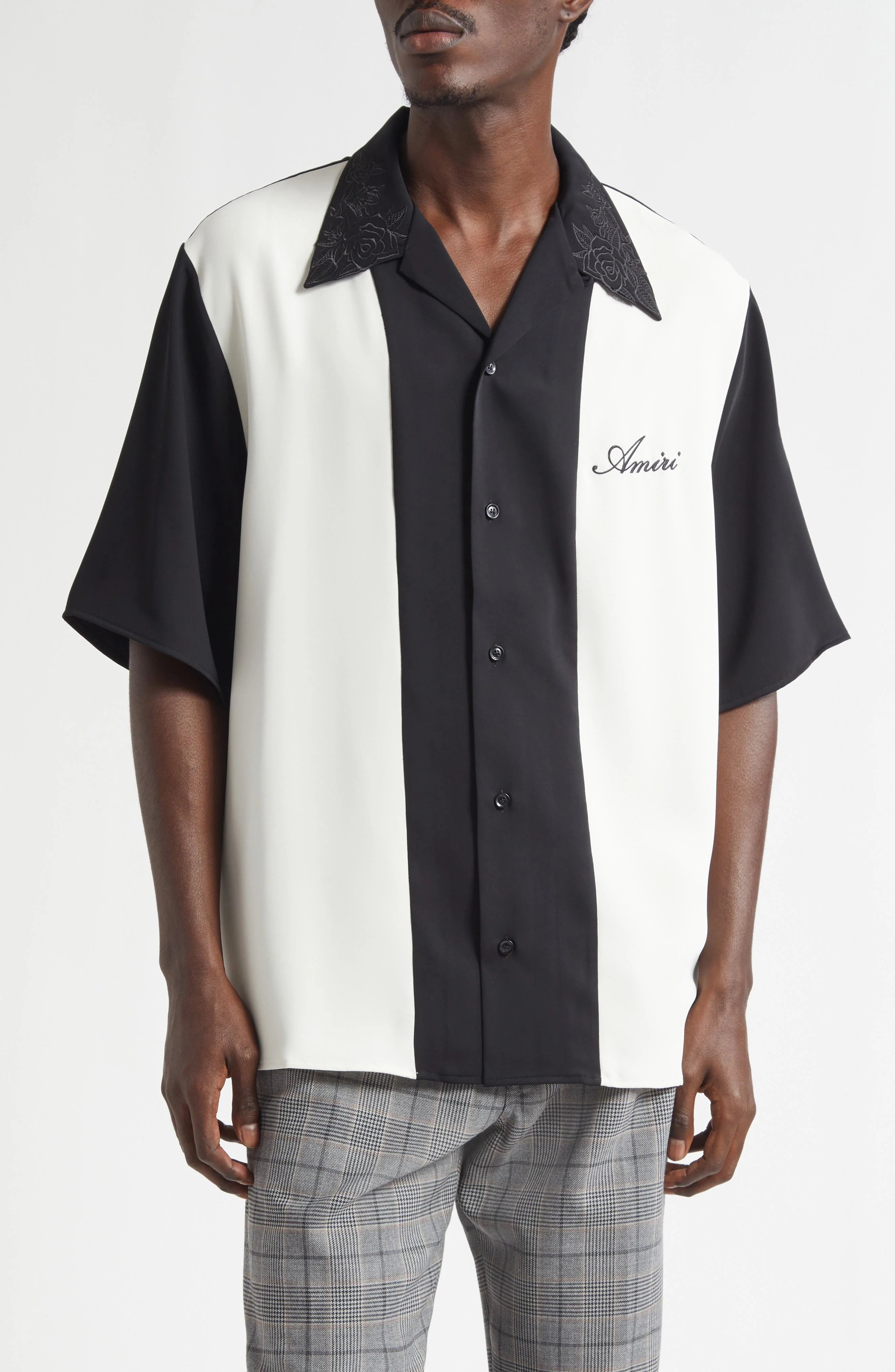 AMIRI Colorblock Floral Embroidered Camp Shirt in Black at Nordstrom