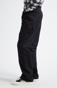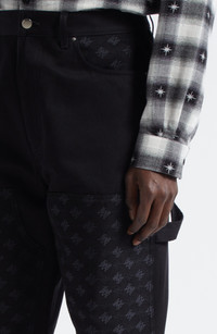 Mike Amiri’s iconic monogram takes center stage in a captivating pattern on these carpenter jeans, crafted from a durable cotton-wool blend. Gleaming metal rivets and reinforced front panels add a utilitarian edge, channeling the retro-cool vibe of his spring ’25 collection. Zip fly with button closure Five-pocket style; tool pockets; hammer loop 70% cotton, 30% wool Dry clean Made in Italy Designer Clothing
