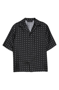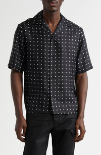 The label's edgy monogram rains all over this luxe button-up crafted in Italy from lightweight silk with a convertible collar. Front button closure Notched collar Short sleeves 100% silk Dry clean Made in Italy Designer Clothing