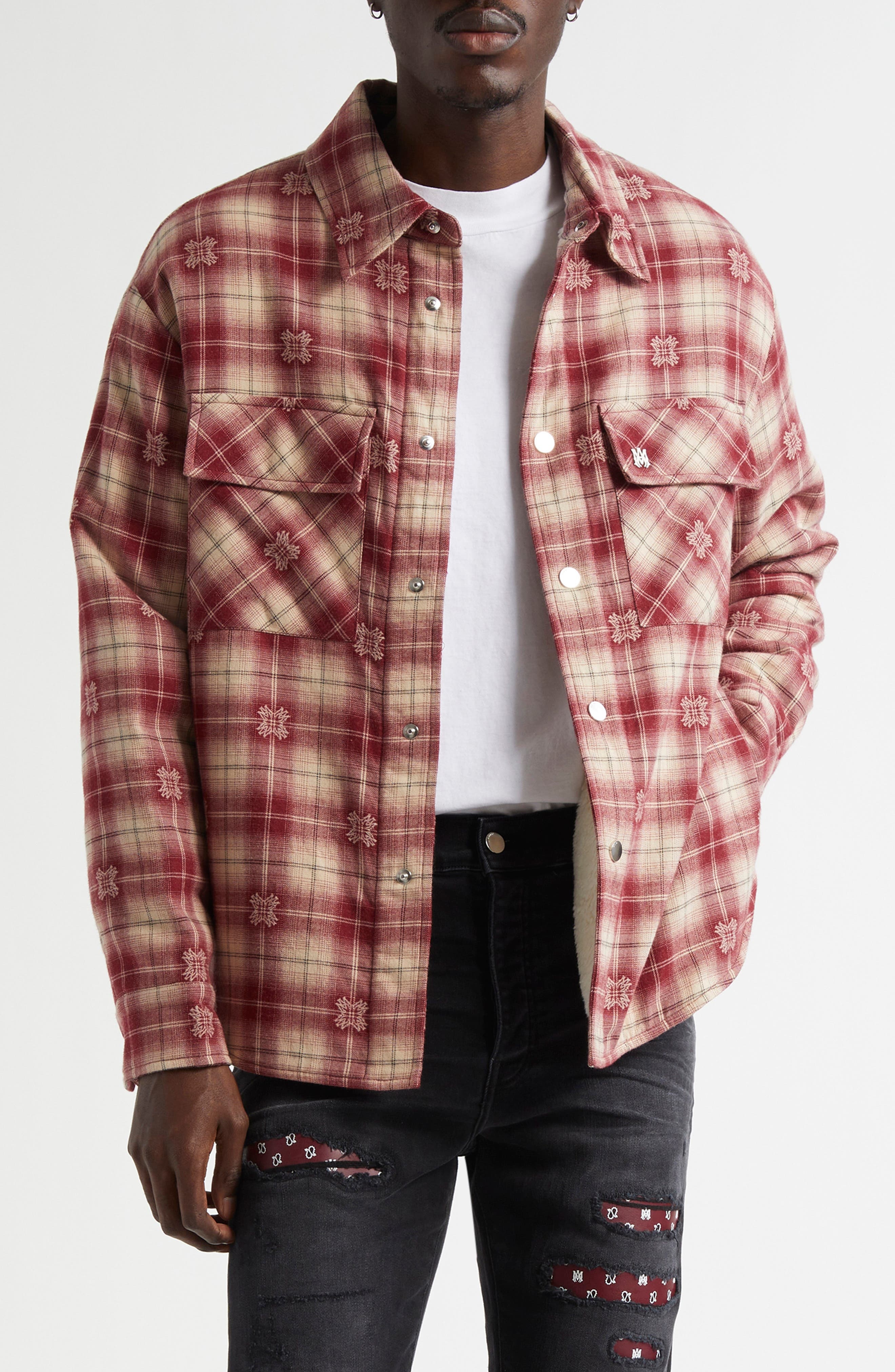 AMIRI Plaid Fleece Lined Cotton Flannel Snap-Up Overshirt in Deep Red at Nordstrom
