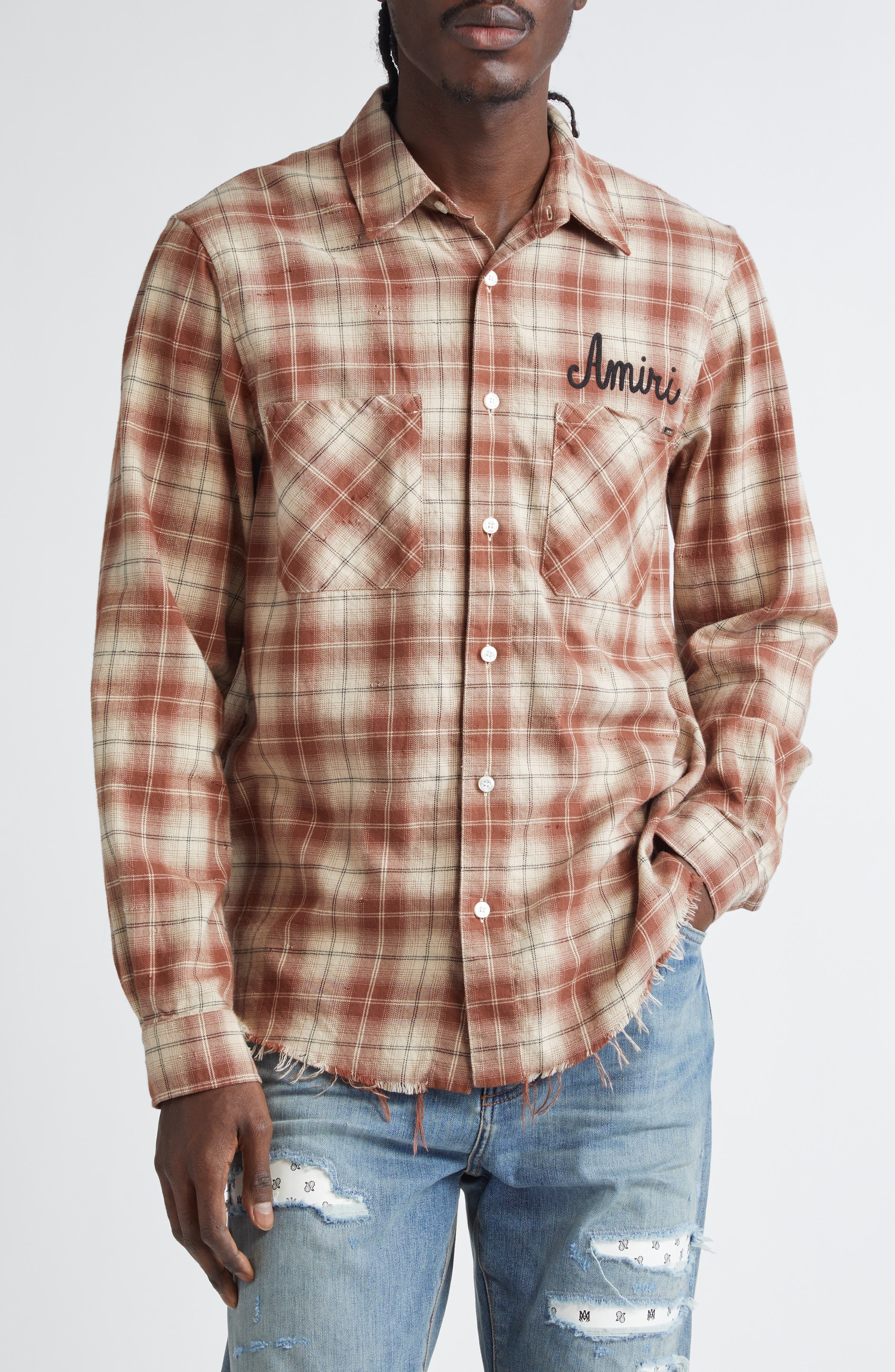 AMIRI Shotgun Distressed Plaid Flannel Button-Up Shirt in Chocolate at Nordstrom