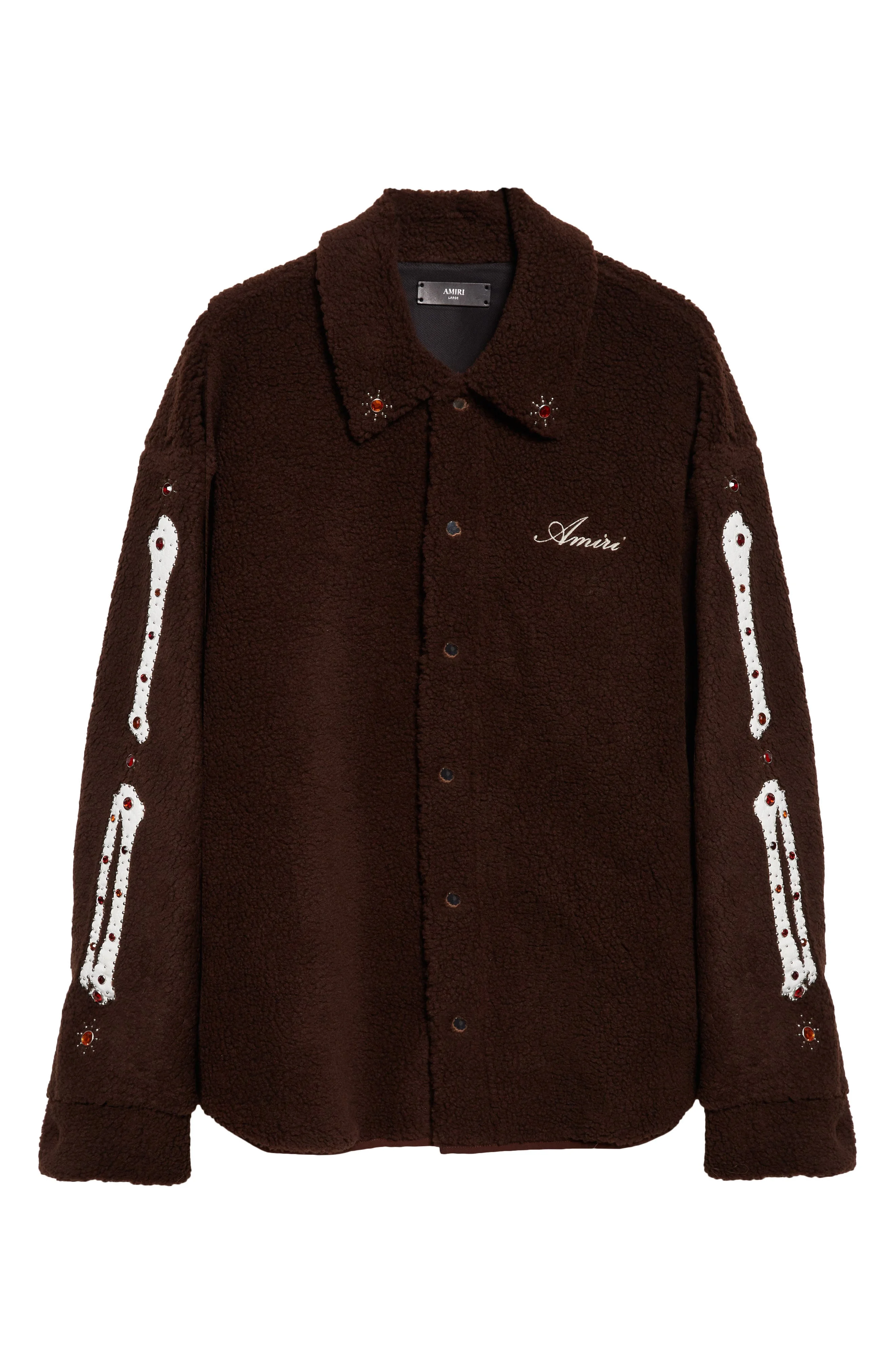 AMIRI Studded Bones Appliqué High Pile Fleece Overshirt in Dark Brown at Nordstrom