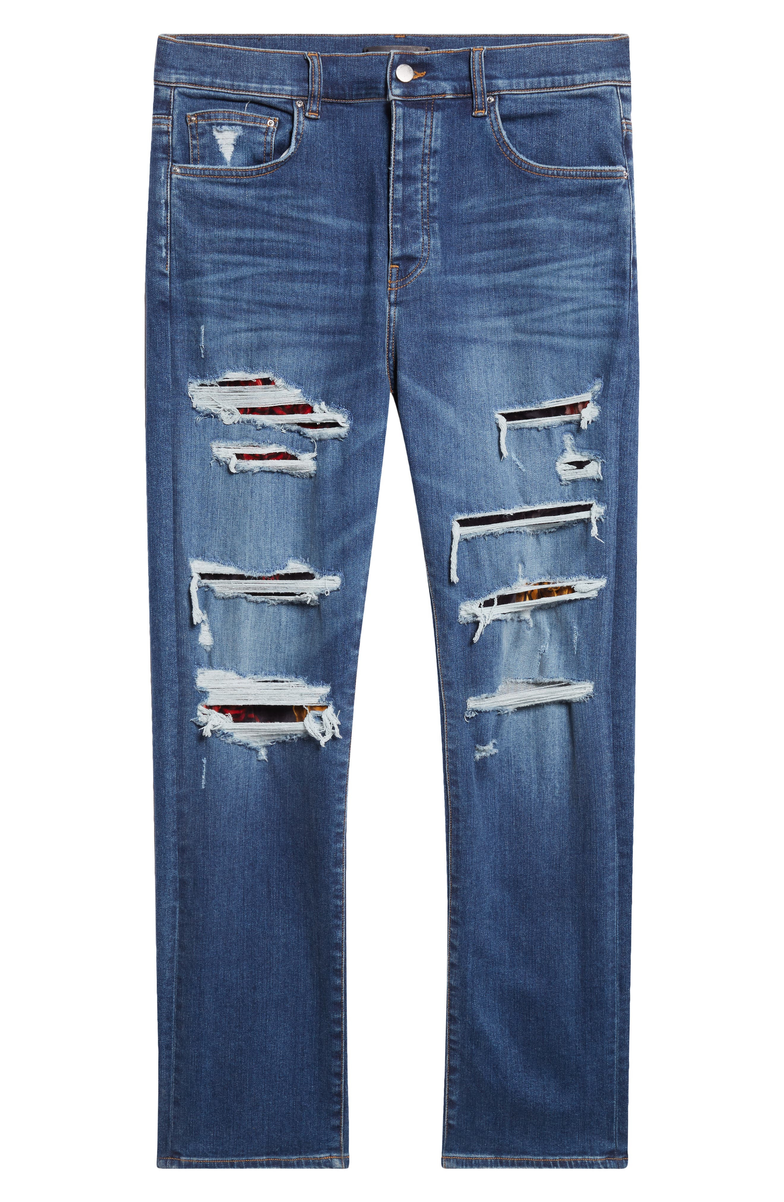 AMIRI Thrasher Slim Fit Distressed Floral Velvet Patch Jeans in Dark Indigo at Nordstrom
