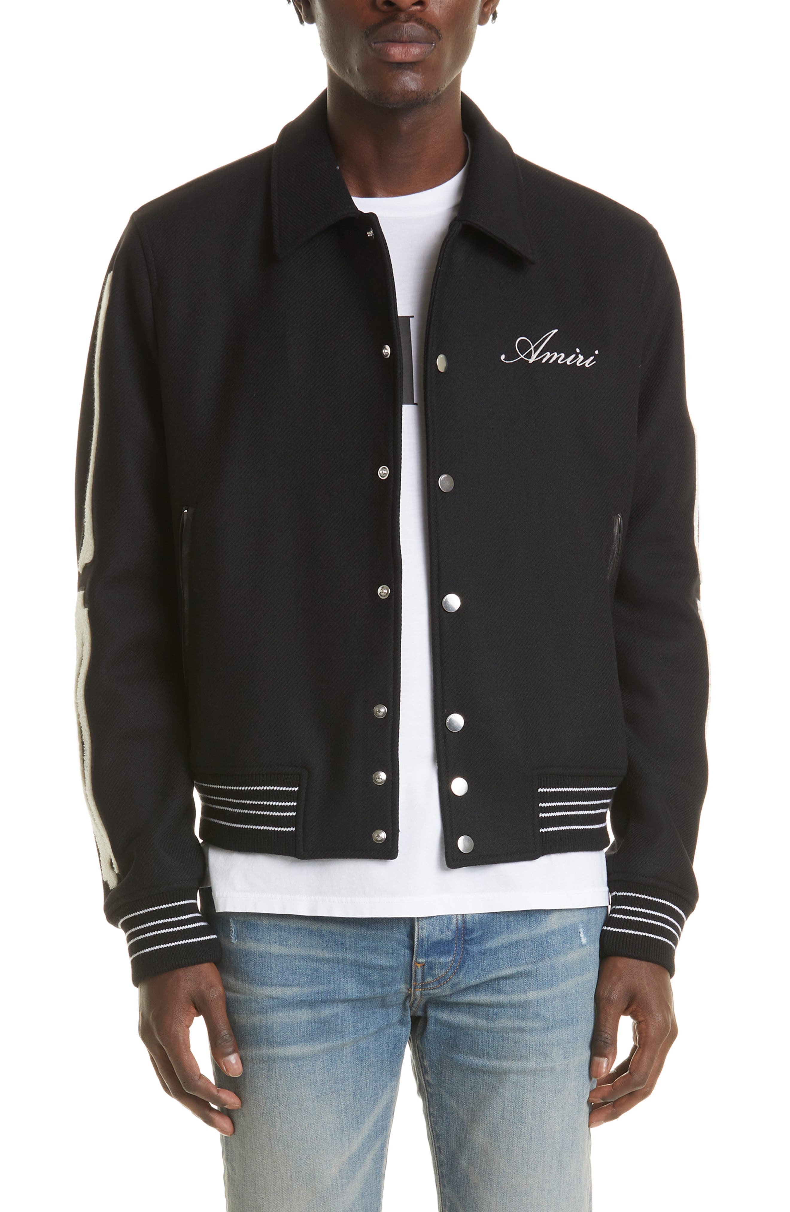 Bouclé bones are put in ulna right places on this jacket made of wool twill with rings of striped ribbing to keep the vibe as varsity as it is humerus. Front snap closure Spread collar Ribbed cuffs and hem Front zip pockets Lined 100% wool Dry clean Made in Italy Men's Designer Clothing