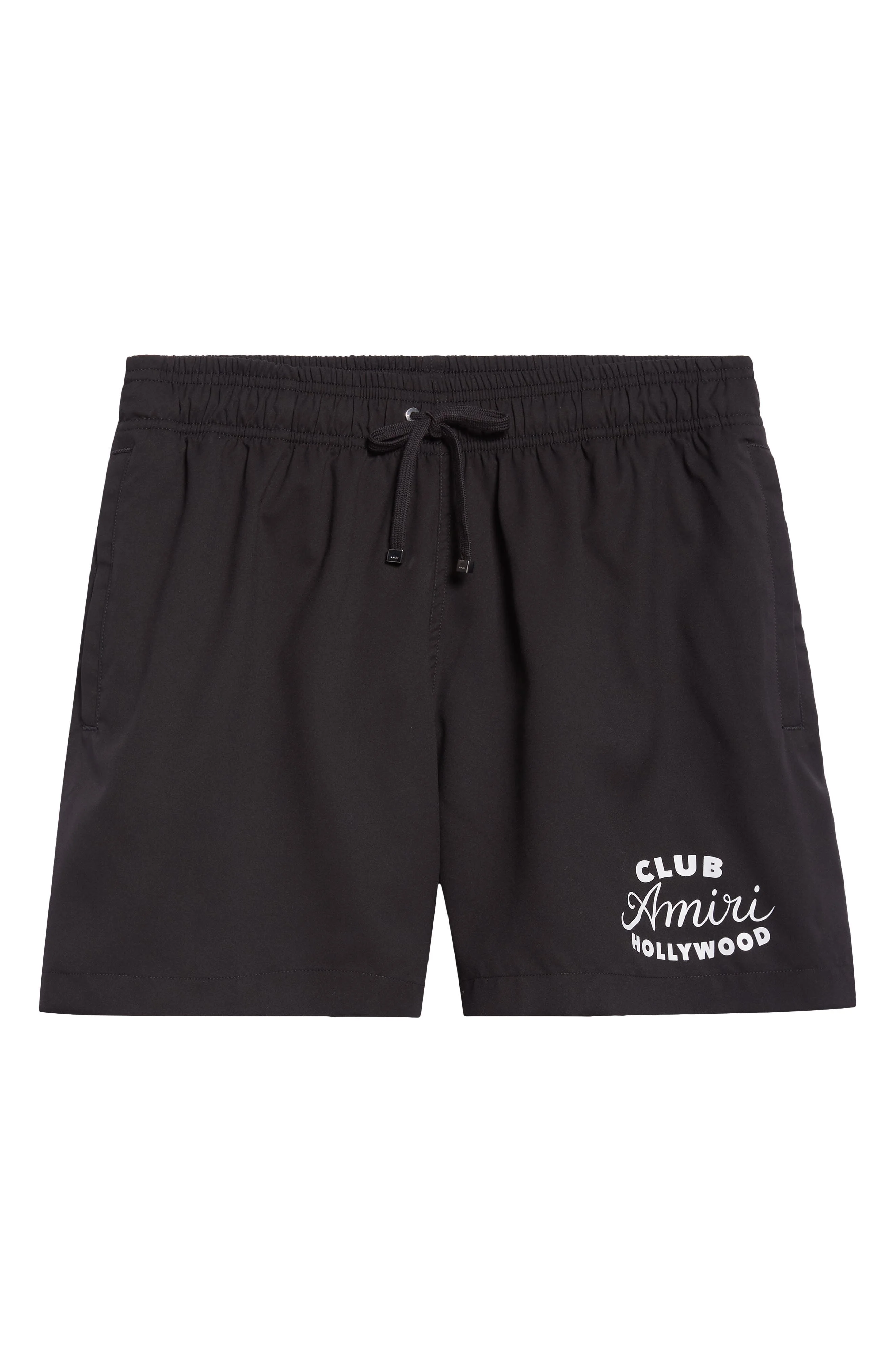 Built for pool-to-after-hours, these durable swim trunks carry the Club Amiri Hollywood logo at the hem like a VIP stamp and turn every cannonball into a late-night cameo. Elastic/drawstring waist Side welt pockets 100% polyester Dry clean Imported Designer Clothing