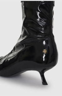 Modern sock booties made from stretch vegan leather with a high-shine finish and subtle crinkled texture. The Hilda Boots' sleek construction features a sharp pointed toe, angular kitten heel, and high-shine outsole. Accented with gold-tone ANINE BING hardware at each heel. Stretch vegan leather High-shine finish Subtle crinkled texture Sharp pointed toe Angular kitten heel High-shine outsole Gold-tone ANINE BING hardware True to size