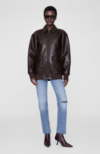 An oversized jacket featuring utility-inspired details made from midweight 100% regenerated leather in deep brown. Perfect for adding a touch of edgy style to any outfit. 48% Leather, 25% Polyester, 27% Polyurethane Product Measurements (Size S): Length: 28.5", Bust: 47", Sleeve Length from Center Back: 34" Model is wearing a size S Model Measurements: Height: 5' 9", Bust: 30", Waist: 23", Hips: 34" Dry clean Fully lined Zip fastening through front Two patch pockets at the hips with snap closures Ribbed trim along cuffs and hem Made in China