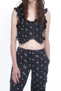 This piece features lovely ruffle details and beautiful embroidered roses. Perfect for layering, it adds a charming touch to any outfit while keeping you comfortable and stylish! Black Multi Fabric: 100% Cotton Hydrocarbon Dry Clean Only Made with love in NYC