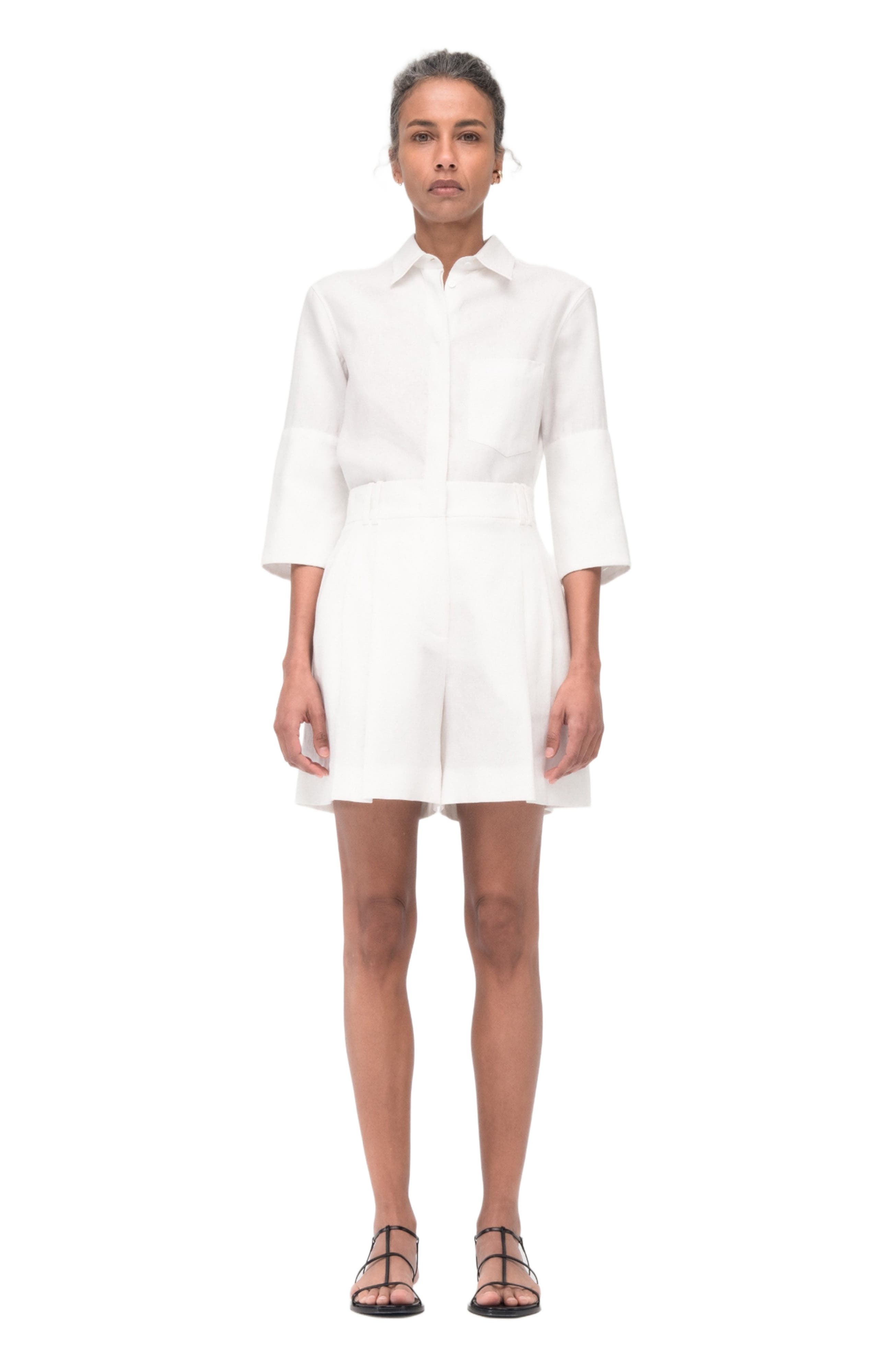 Crafted in featherweight linen, this is a quintessential pleated summer short. Sitting at the true waist, the trousers close at the front fly with a hook and bar button made of corozo, with additional welts in the back that fasten with self-covered buttons. The soft natural wrinkle is a hallmark of linen, and need not be steamed.Made from flax grown in Europe. Linen is a naturally low impact textile that doesn’t require pesticides or heavy irrigation. We prioritize linen made from non-GMO flax grown in Europe, because of a centuries-long history of quality craftsmanship and sound environmental practices in that region. 100% Linen Sits At Natural Waist Pleats At Front Front Fly With Zipper And Hook And Bar Corozo Button Closure Back Welt Pockets With Self Covered Buttons Dry Clean Sparingly