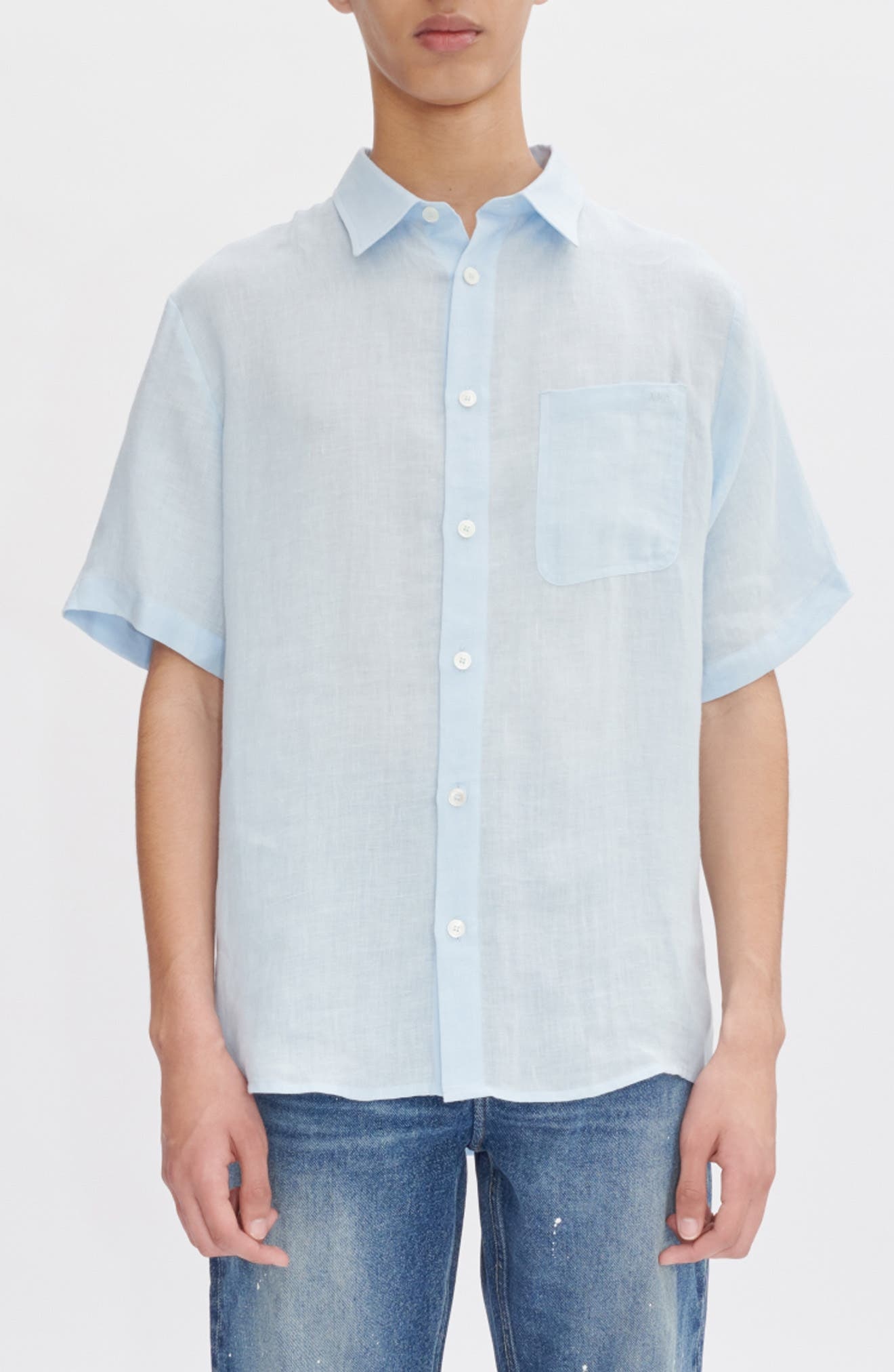 A.P.C. Bellini Logo Embroidered Short Sleeve Linen Button-Up Shirt in Iab Light Blue at Nordstrom