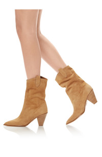 Soft, velvety suede gives this Western-inspired bootie a bit of cool slouch while a streamlined design and cone heel refine the look. 3" (76mm) heel (size 38.5) 7 1/2" shaft Leather upper, lining and sole Made in Italy Salon Shoes