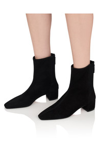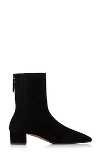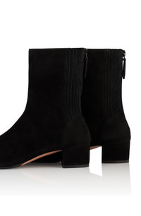 A sleek silhouette with minimalist styling enhances the timeless appeal of this kid suede bootie framed with an elongated toe and low block heel. 1 1/4" (32mm) heel Back zip closure Leather upper, lining and sole Made in Italy Designer Shoes