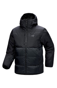 This lightweight hooded jacket featuring 750-fill-power goose down and a water-resistant finish will keep you feeling warm and dry as you brave the wintry weather. Arcteryx's Down Composite Mapping™ technology combines the goose-down insulation with panels of Coreloft synthetic insulation in the hood, cuffs and under the arms (areas prone to moisture), while down is used in the sleeves and around the body's core. Two-way front zip closure with chin guard Fixed hood Down Composite Mapping strategically places synthetic insulation in areas where moisture may buildup and down in areas for maximum warmth Down Contour Construction™ allows the down to form to the body for more efficient thermal performance Wind resistant Durable water-repellent (DWR) finish Lined, with 750-fill-power goose down and Coreloft synthetic insulation 100% nylon Machine wash, tumble dry Imported