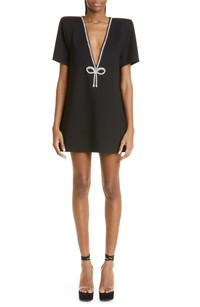 Area Crystal Bow V-Neck Ponte Knit T-Shirt Minidress in Black at Nordstrom