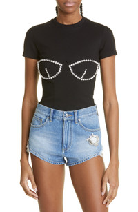 Signature crystals trace the sculpted bustier cups of this corset-inspired T-shirt cut from silky stretch-enhanced jersey. 17 1/2" length (size Medium) Crewneck Short sleeves 67% rayon, 28% nylon, 5% elastane Dry clean Imported Women's Designer Clothing