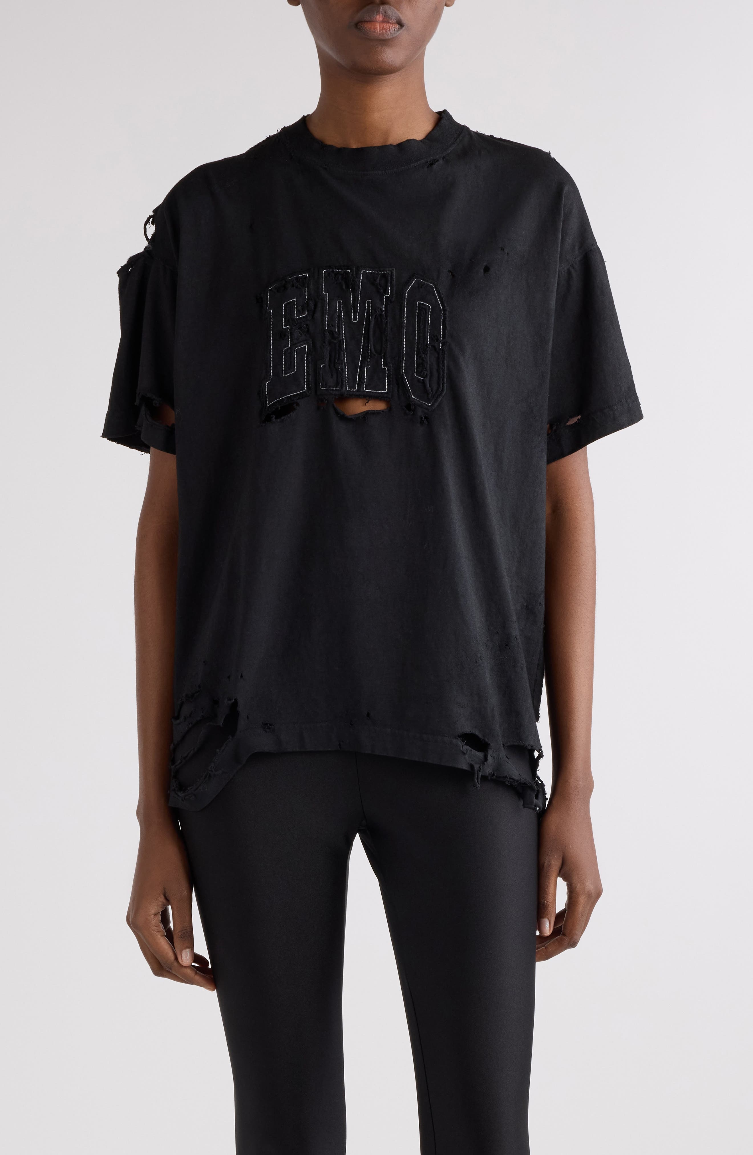Balenciaga Boxy Distressed Emo Embroidered T-Shirt in 1041 Faded Washed Black at Nordstrom