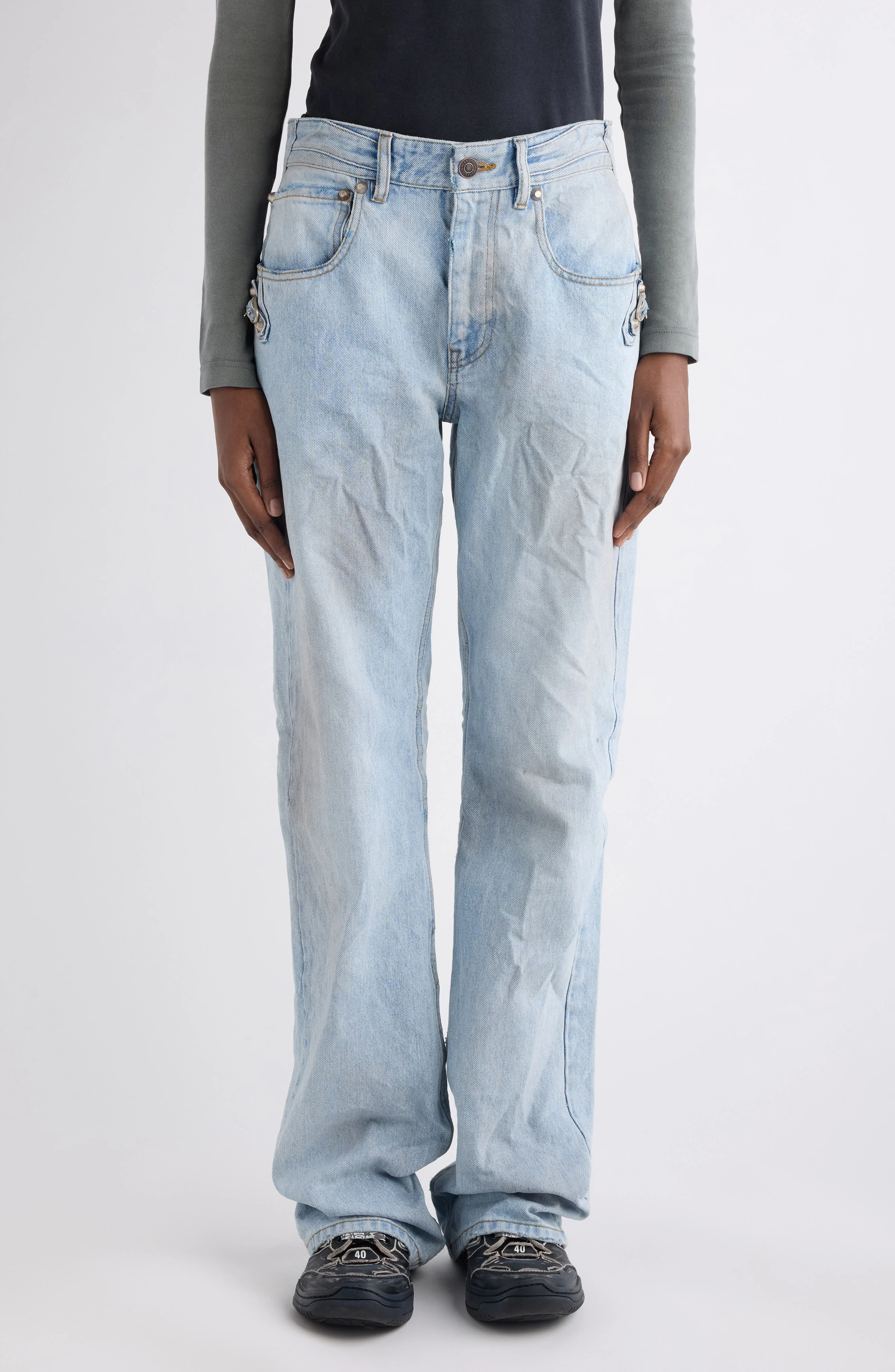 Structured in rigid denim that holds its line, these straight-leg jeans borrow cues from the Le City bag as gleaming hardware and tabbed touches trace the sides and back pockets for quiet brand fluency. Subtle fading and soft abrasions add grit without noise so the silhouette stays crisp while the attitude lands street-smart. Zip fly with button closure Five-pocket style 100% cotton Dry clean Made in Japan Designer Clothing