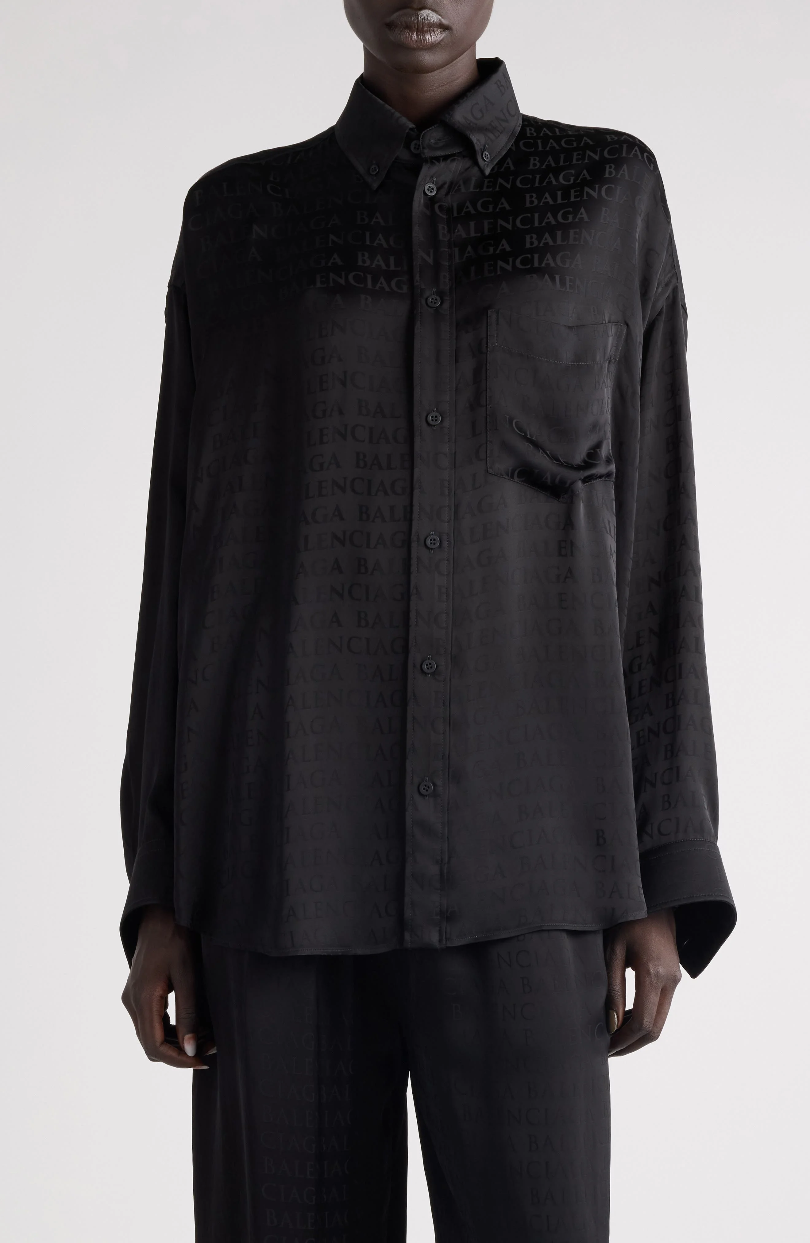 Balenciaga Cocoon Logo Jacquard Oversize Satin Button-Up Shirt in 1000 Black at Nordstrom