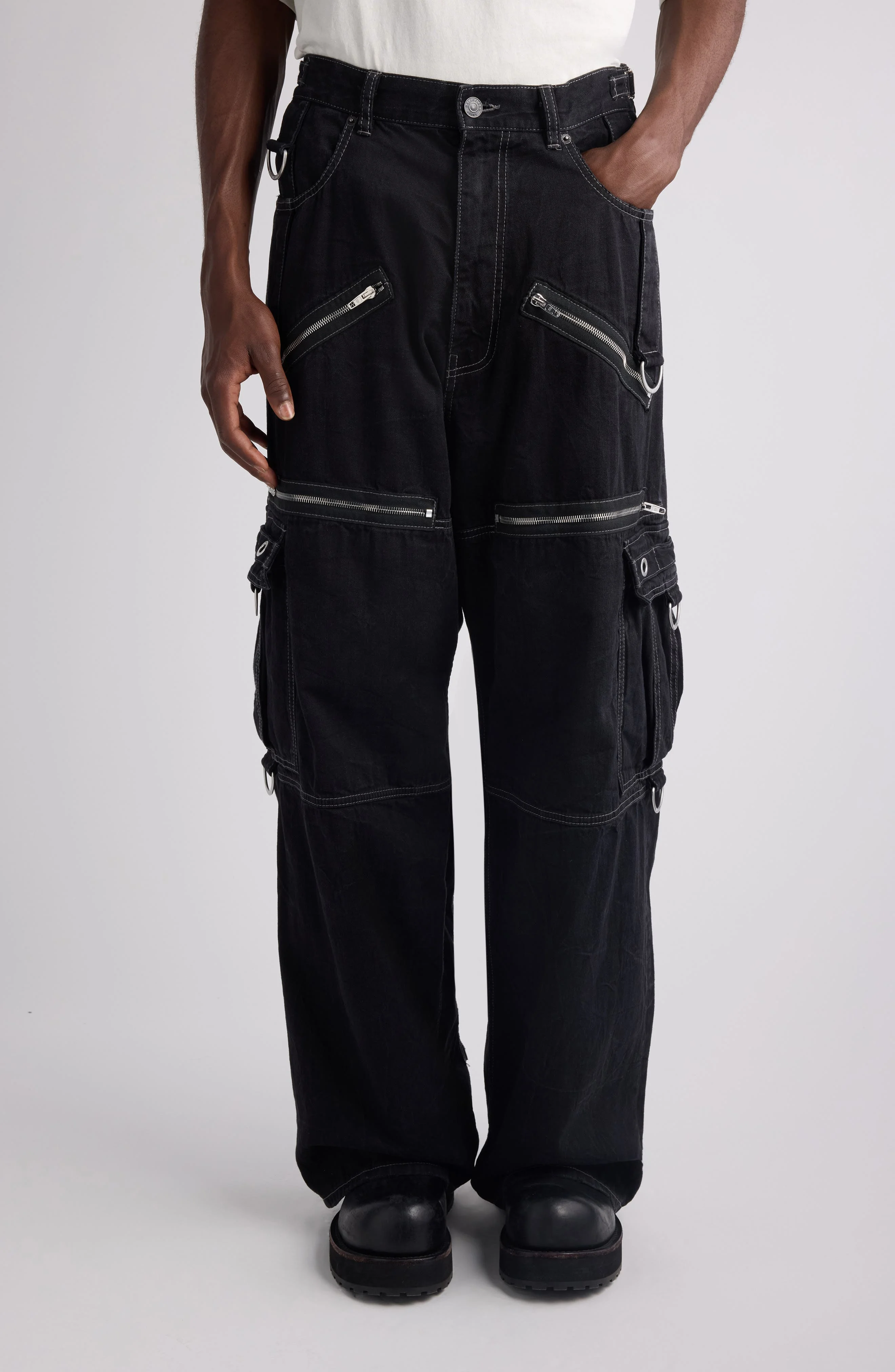 These baggy cargo pants loaded with silvery zippers, D-rings and grommets are crafted in Japan from lightweight Japanese denim and washed for a subtle worn-in effect. Zip gussets at the cuffs allow leg width to be adjusted, while side tabs can be cinched at the waist. Zip fly with button closure Front scoop pockets; back patch pockets; front slant and horizontal zip pockets; cargo flap-patch pockets Adjustable buckle side tabs Zip-gusset cuffs 100% cotton Machine wash, dry flat Made in Japan Designer Clothing