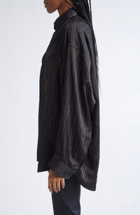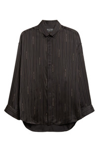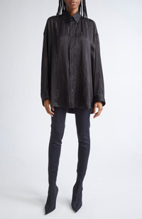 Demna revisits the maison's iconic cocoon shape with this fluid Italian-satin shirt in a dramatic oversized design that nods to the exaggerated tailoring of master courtier Cristobal Balenciaga. Front button closure Button-down collar Long sleeves with button cuffs Dropped shoulders Curved hem 100% viscose Dry clean Made in Italy Designer Clothing