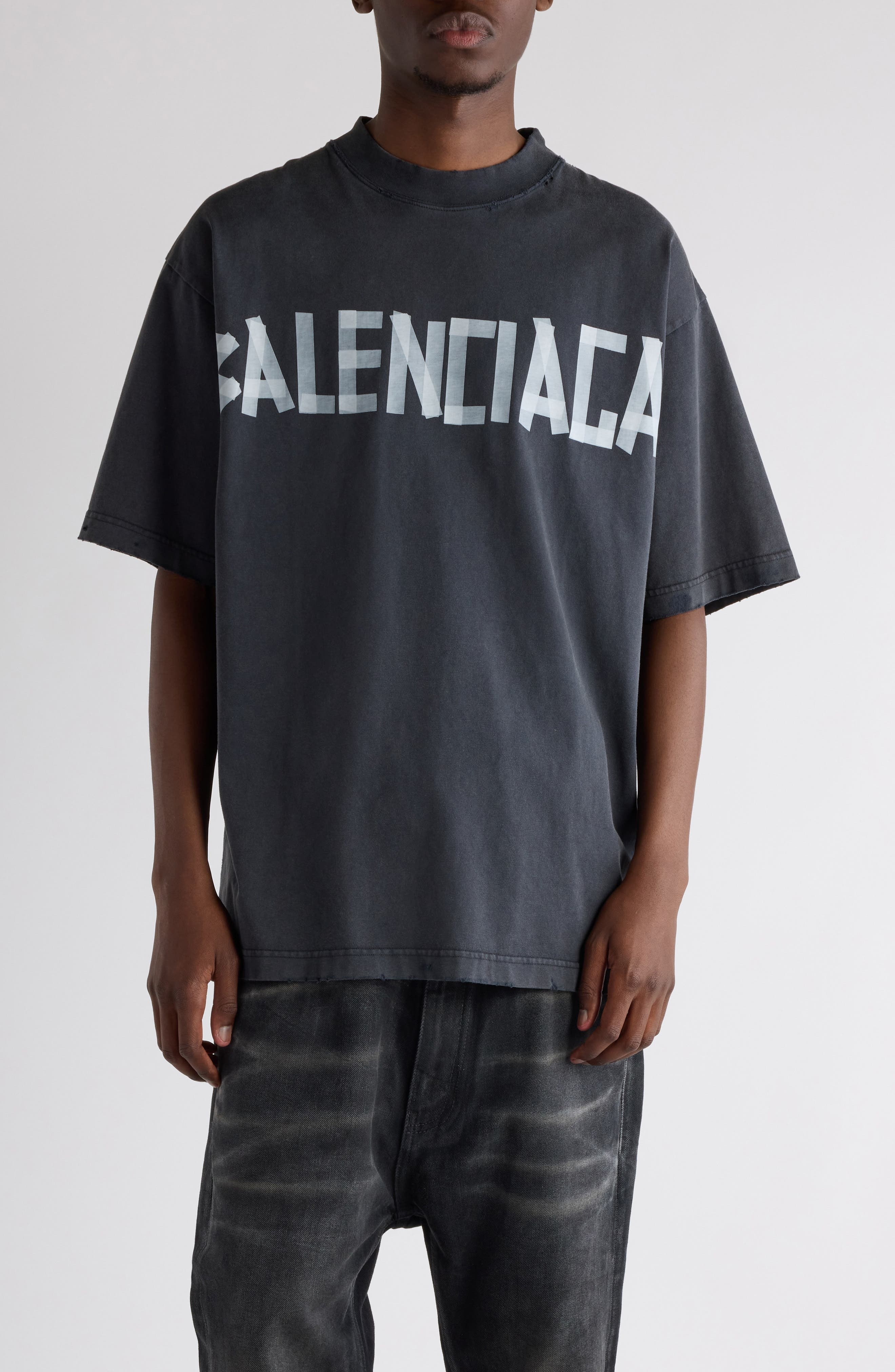 Demna sticks to his subversive, DIY approach in this washed-out and subtly distressed cotton T-shirt featuring dual Tape Type logos—riffs on Balenciaga's polarizing packing-tape bracelet. Crewneck Short sleeves Dropped shoulders 100% cotton Hand wash, line dry Made in Portugal Designer Clothing