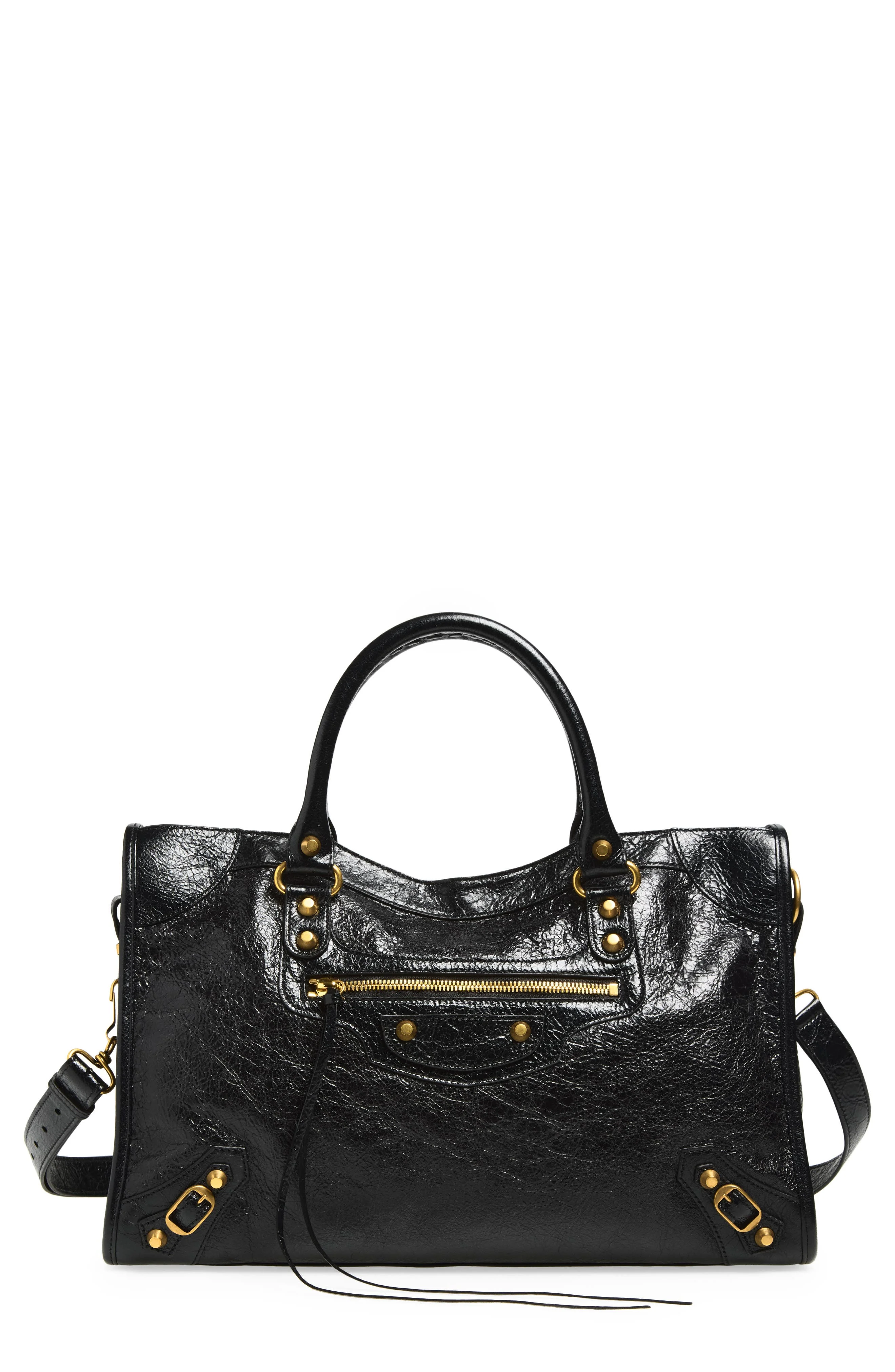 Balenciaga relaunches its iconic Y2K bag with this roomy style that's made from crinkled lambskin leather and detailed with golden hardware. Top zip closure Top carry handles; removable, adjustable crossbody strap Exterior zip pocket Interior zip pocket Cotton-canvas lining Leather Made in Italy Designer Handbags