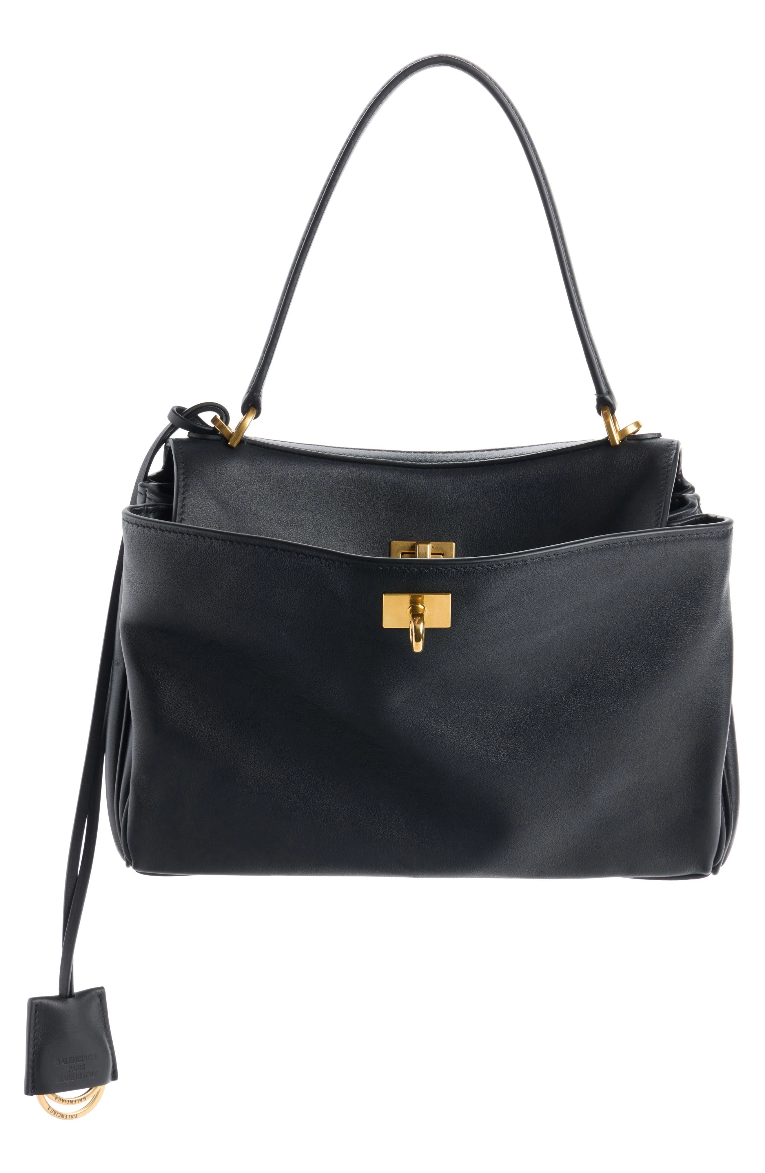 The epitome of understated luxury, this top-handle bag crafted of supple calfskin features a slouchy silhouette that's adjustable with side snaps. Turnlock closure Top carry handle; removable, adjustable crossbody strap Exterior slip pockets Removable key ring Lambskin-leather lining Leather Made in Italy Designer Handbags