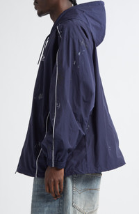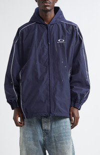 Grungy smudges and paint splatters bring an artful edge to this relaxed track jacket crafted in Italy from lightweight techno poplin fabric. Classic optic-white piping along the sides adds a sleek contrast to Demna's signature subversive aesthetic. Two-way front-zip closure Fixed hood Elastic cuffs Hidden side-zip pockets Dropped shoulders Lined 50% cotton, 50% polyamide with 100% polyester contrast Machine wash, line dry Made in Italy Designer Clothing