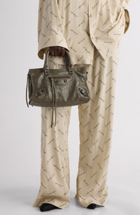 Balenciaga relaunches its iconic Y2K bag with this updated style crafted from crinkled lambskin leather and detailed with signature hardware. Top zip closure Top carry handles; removable, adjustable shoulder strap Exterior zip pocket Interior zip pocket Leather Made in Italy Designer Handbags