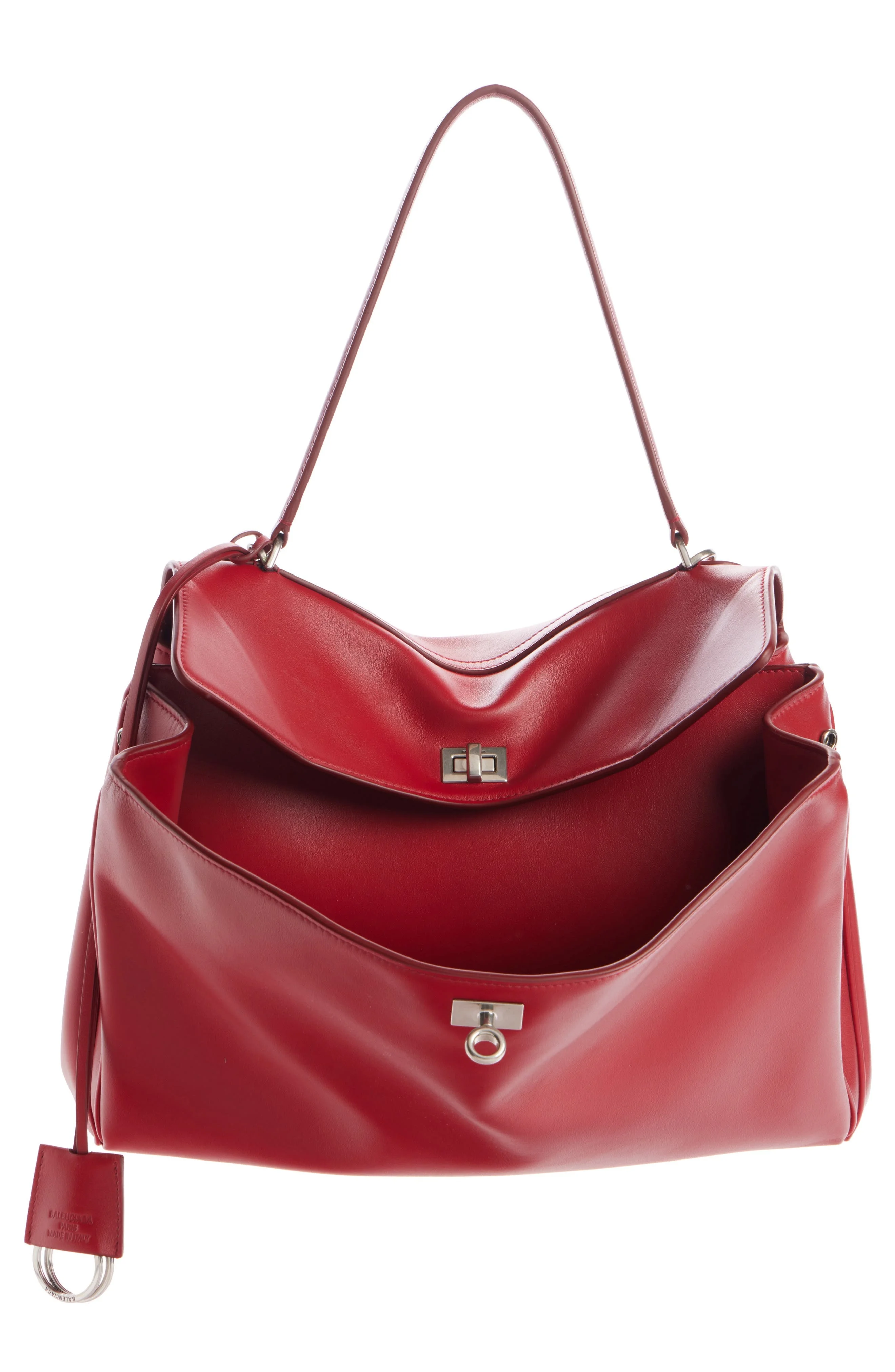 The epitome of understated luxury, this top-handle bag crafted of supple calfskin leather features a slouchy silhouette that's adjustable with side snaps. Turnlock closure Top carry handle; removable, adjustable shoulder strap Exterior slip pockets Removable key ring Protective metal feet Leather Made in Italy Designer Handbags