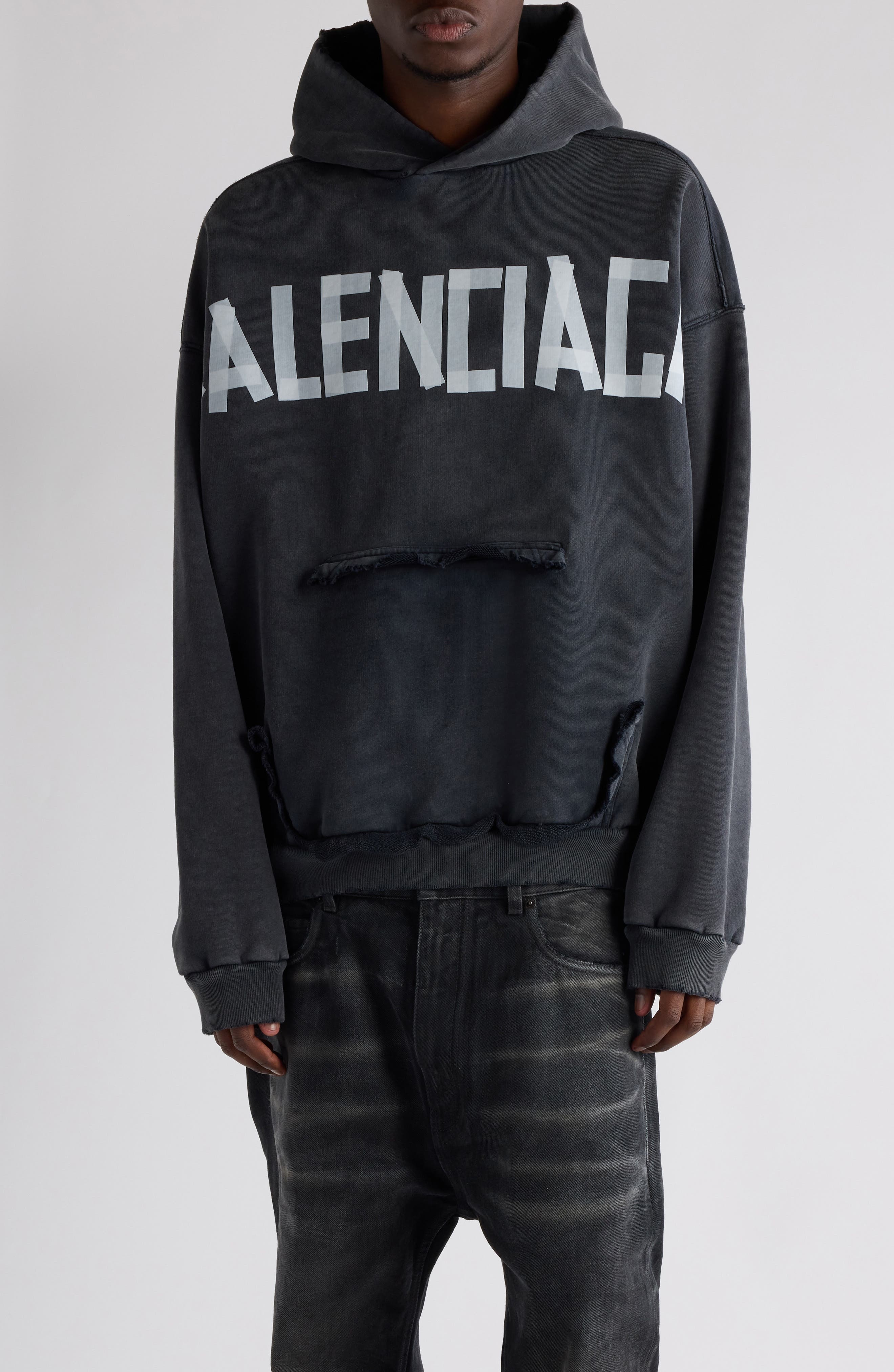 Balenciaga Tape Type Ripped Pocket Large Fit Fleece Hoodie in Faded Washed Black at Nordstrom