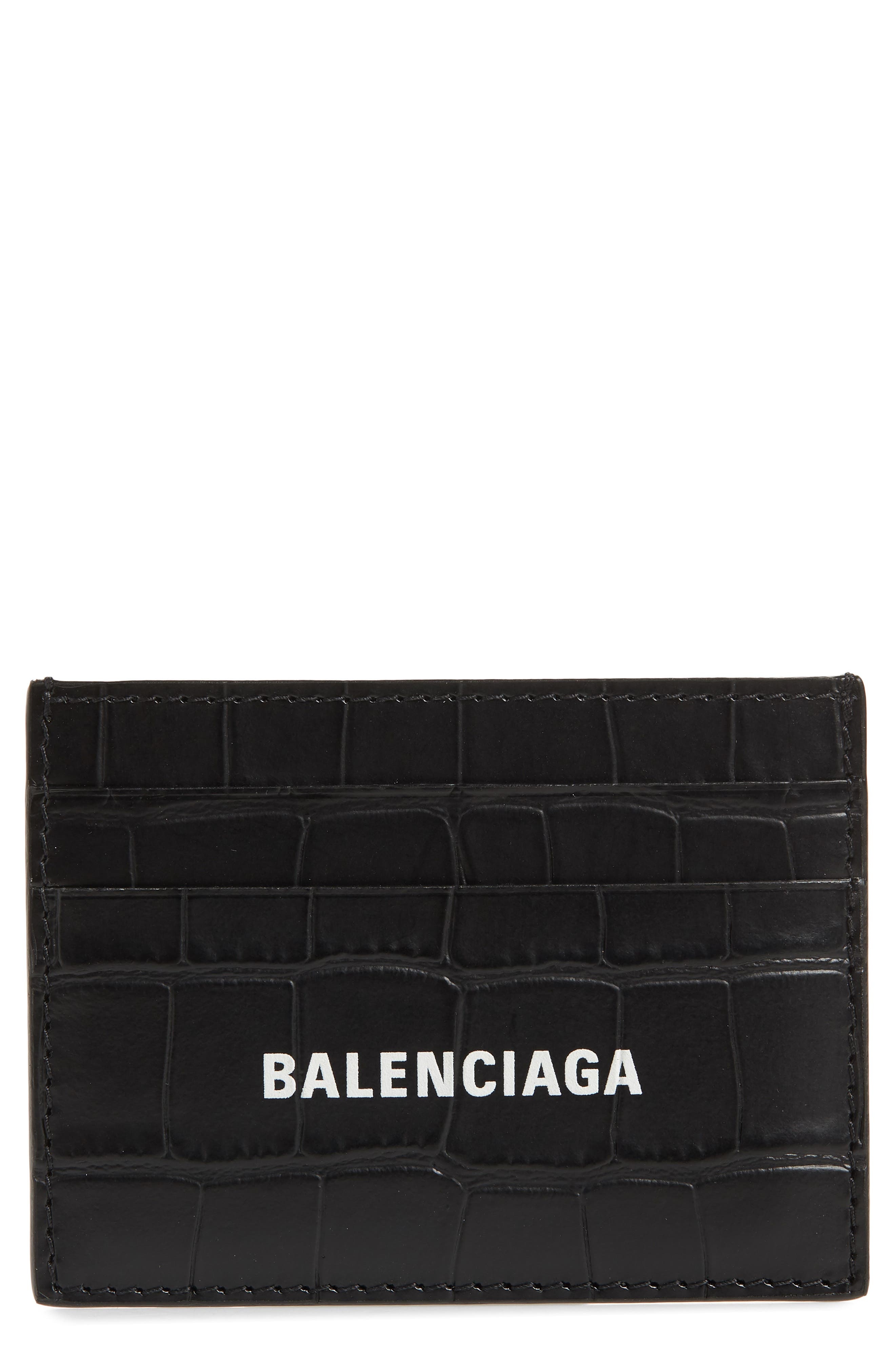 Bold logotype pops against the glossy croc-embossed leather of this slim card case with a handy center slip pocket for securing cash. 3"H x 4"W x 1/8"D Four exterior card slots; center slip pocket Leather Made in Italy
