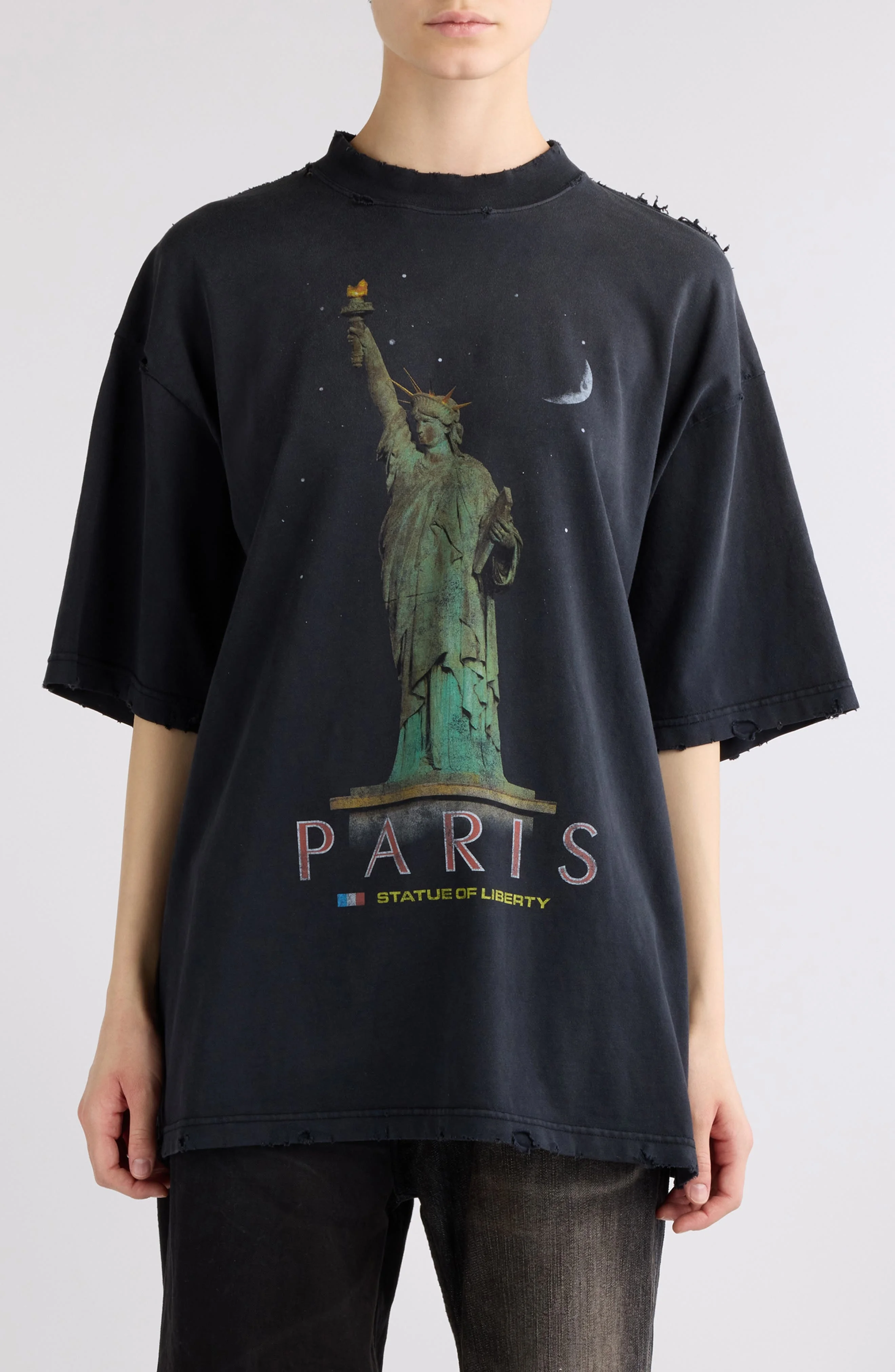 A destroyed and washed-out effect adds old-favorite appeal to this roomy T-shirt featuring Paris Liberty artwork printed on the front. 30" length (size medium) Crewneck Elbow-length sleeves 100% cotton Dry clean Made in Portugal Designer Clothing