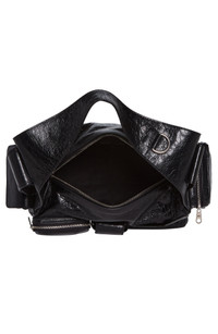 A spacious interior compartment and an assortment of exterior pockets and card slots make this crinkled-leather sling bag a utilitarian essential. Two-way top-zip closure Shoulder strap Four exterior zip pockets; one magnetic-snap flap pocket; ear pod case, three card slots Cotton-canvas lining Leather Made in Italy