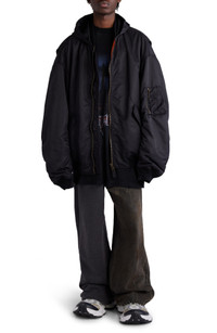 Balenciaga's streetwear-ready aesthetic is on display with this oversized, hooded bomber jacket branded with taped-up logo lettering for a DIY vibe. 29" length (size 2) Two-way front-zip closure Fixed hood Ribbed cuffs and hem Front welt pockets; sleeve utility pocket Lined, with silk/polylactide fill 100% polyamide Hand wash, line dry Made in Italy Designer Clothing