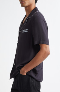 Claim your spot in Olivier Rousteing's Balmain universe with this silky, lightweight shirt starring a celestial pattern grounded by classic piping. Front button closure Notched collar Short sleeves 100% viscose Dry clean Made in Italy Designer Clothing