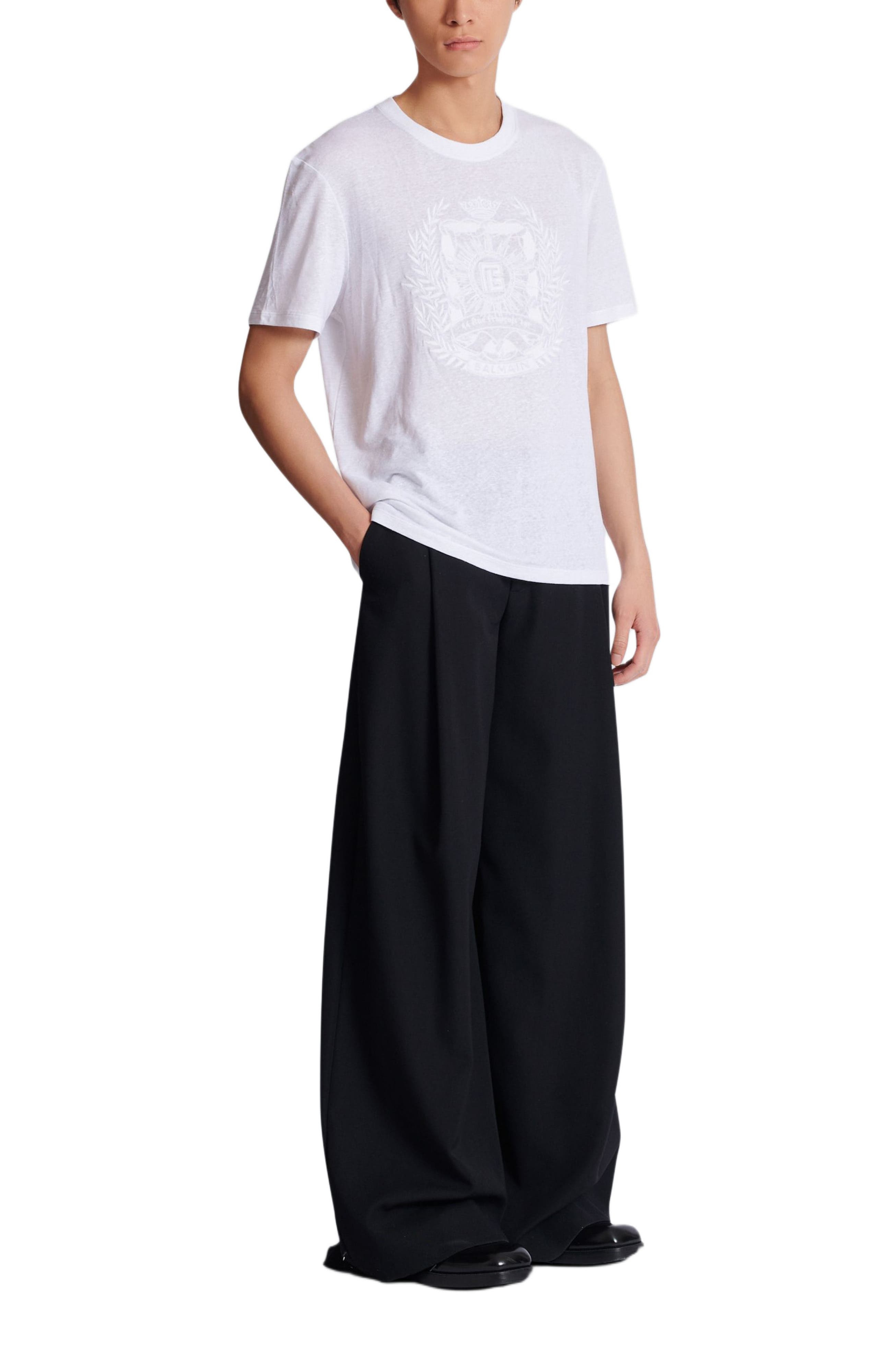 Balmain Ecusson embroidered linen T-shirt Round neck with ribbed trim Short sleeves Tone-on-tone Balmain Ecusson embroidery on the front Regular fit Model measures 190cm and wears a size M Main material: 94% linen 6% elastane Made in Portugal Item: FH1EG000BD09