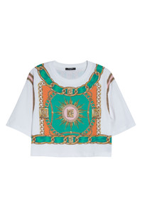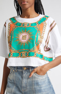 Elevate your casual looks with this boxy cropped T-shirt emblazoned with an opulent scarf-inspired print with founder Pierre Balmain's monogram worked into the pattern. Crewneck Elbow-length sleeves 100% cotton Dry clean Made in Portugal Designer Clothing