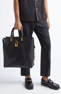 A logo-engraved padlock takes center stage on this shopper-inspired tote made from waxy calfskin leather and showcasing a roomy silhouette to hold your commuting essentials. Carry it by the top handles or clip on the optional strap for shoulder carry. 15"W x 15"H x 6"D 5" handle drop Two-way top-zip closure Top carry handles; removable strap Removable padlock; removable key chain Interior zip pocket; card slot Fits most 15" laptops Protective leather feet Canvas lining Leather Made in Italy