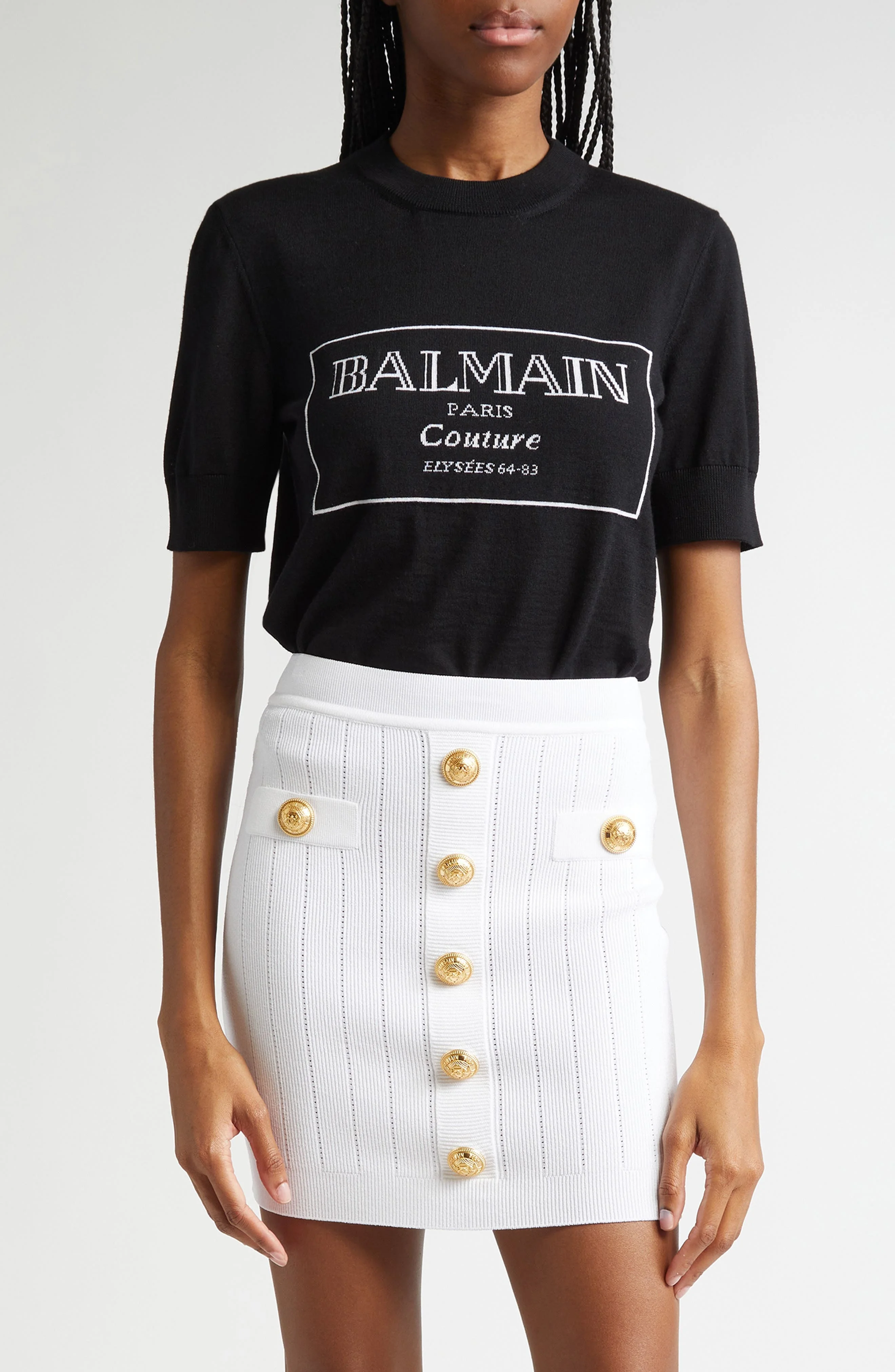 Balmain Logo Jacquard Short Sleeve Merino Wool Sweater in Eab Black/White at Nordstrom