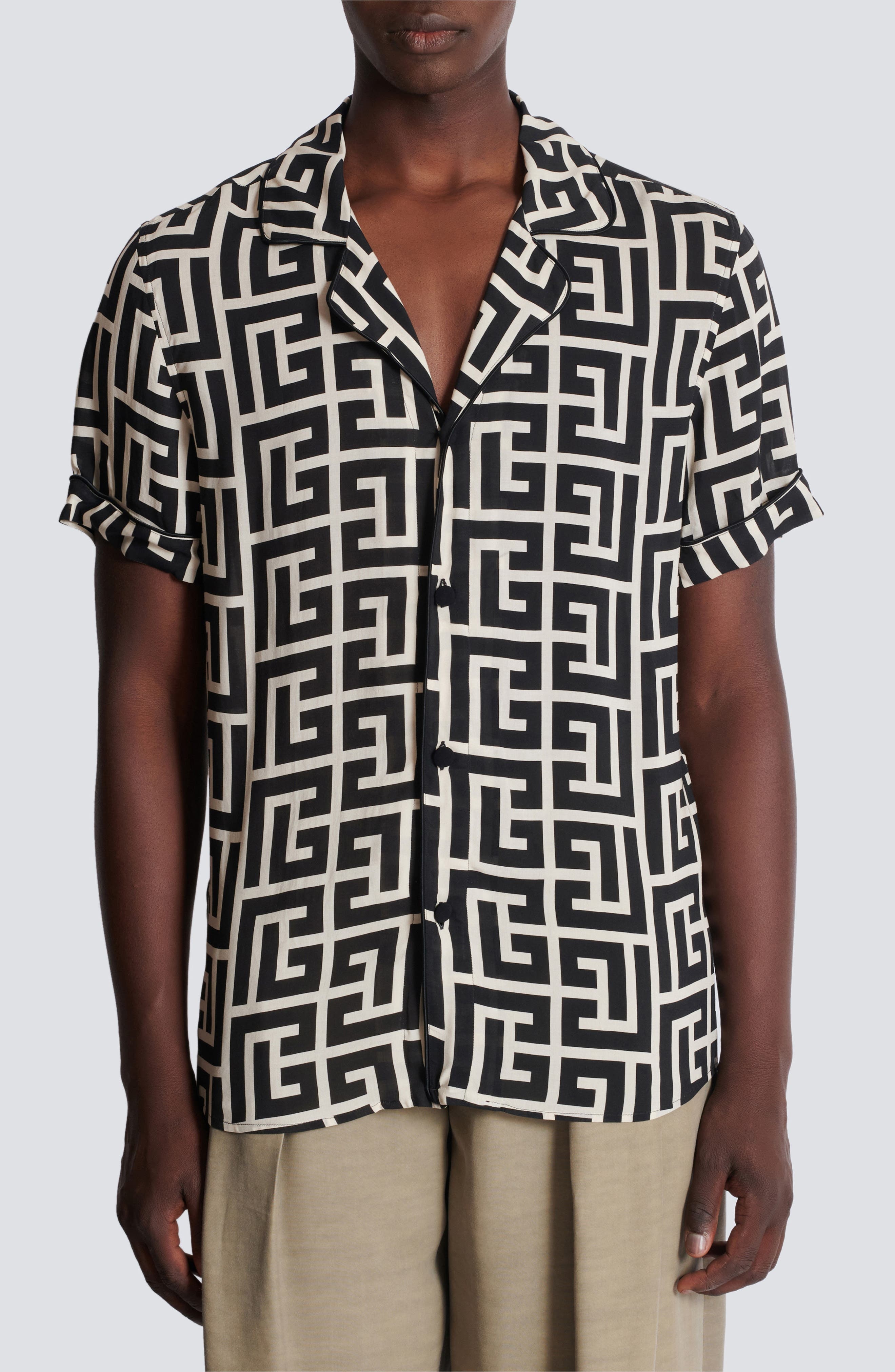 Pierre Balmain's fascination with France's labyrinthine gardens inspires the monogram pattern on this silky button-up shirt set off with classic piping. Front button closure Notched collar Short sleeves 100% viscose Dry clean Imported Designer Clothing