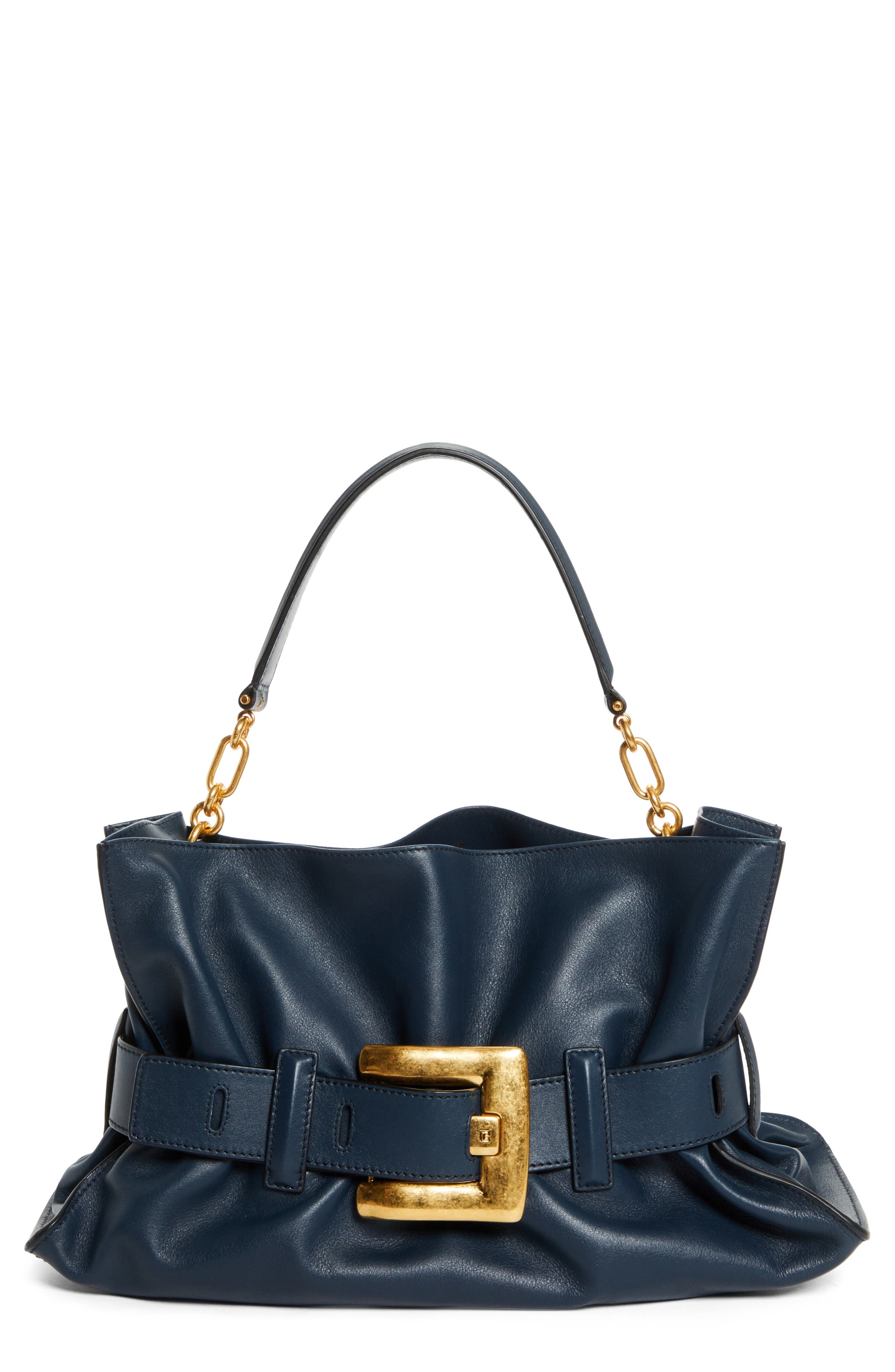 The new Anthem bag—a tribute to the house’s enduring ties with the world of music—debuted on the spring '25 runway and takes inspiration from the mid-century Jolie Madame silhouette and modern Balmain tailoring. The tote's belted outline that cinches the style and oversized golden buckle honor house codes and offer bold, timeless elegance. 17 1/4" x 10 1/4" x 6" Open top cinched with adjustable belt Shoulder strap Interior zip pocket; card slot Leather Made in France Designer Handbags